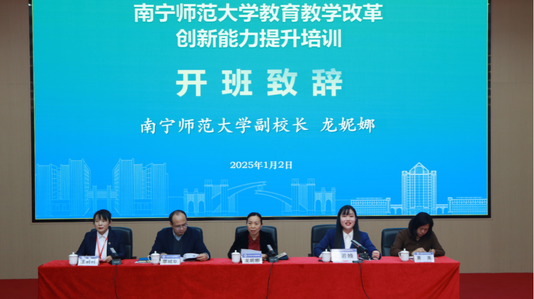 为提升教师教书育人能力,更好地为学校高质量发展提供有力的人力支撑,学校委托广西高等学校师资培训中心(以下简称高师培训中心)开展教师发展专项计划。1月2日下午,教师发展专项计划第一期教育教学改革创新能力提升培训班顺利开班。学校副校长龙妮娜出席开班仪式并致辞,开班仪式由高师培训中心副主任闫若婻主持。高师培训中心项目管理团队、教务处、教育评价与教师发展中心负责人及来自学校22个学院各专业的151名教师参加了开班仪式。