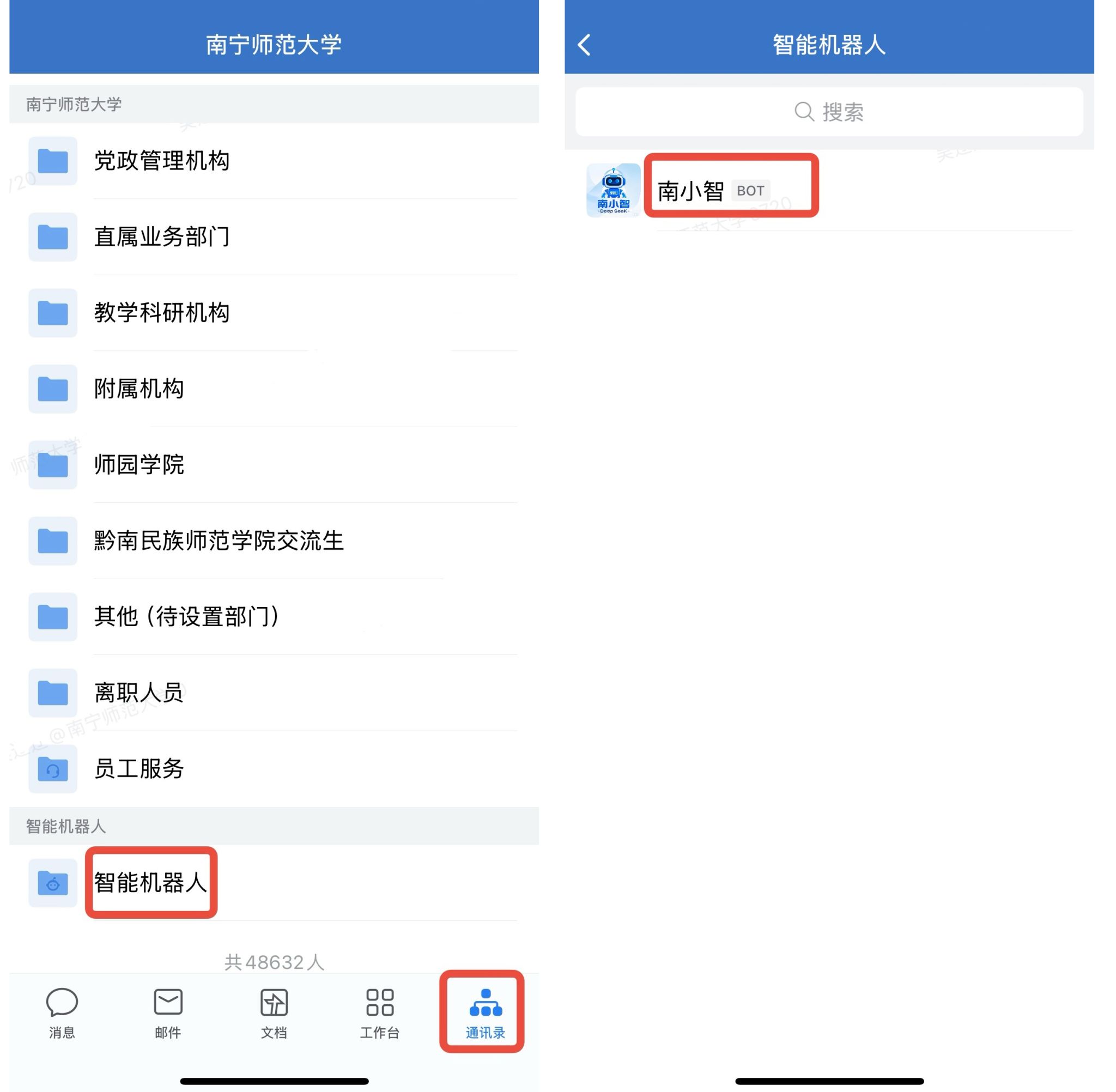 2.进入“通讯录”板块,找到并点击“智能机器人——南小智”;