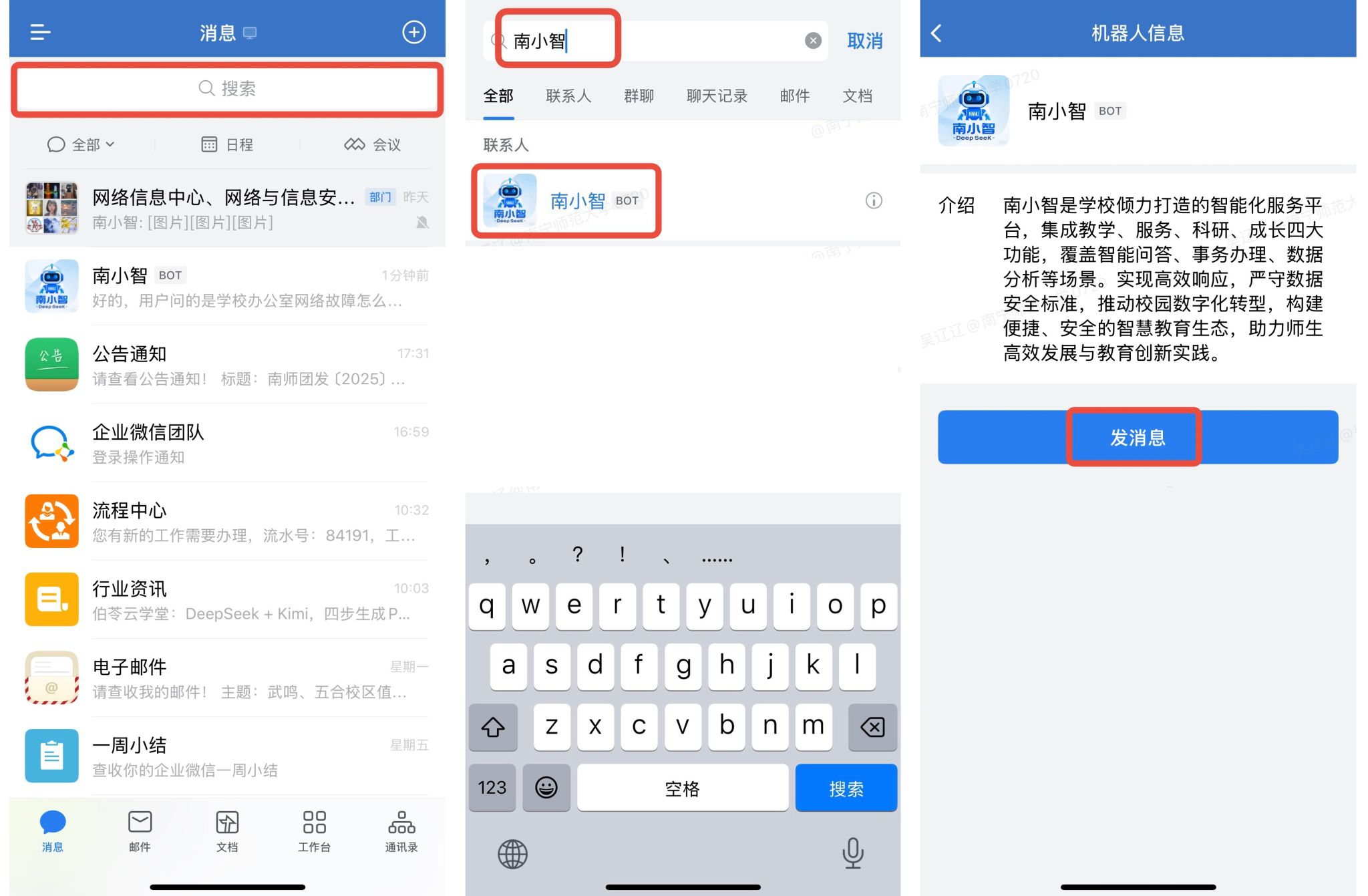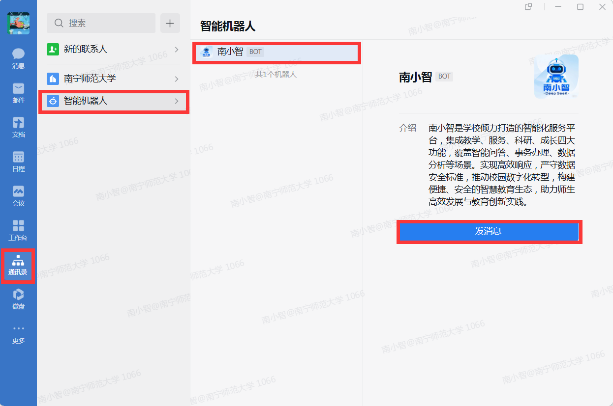 4.选择“南小智”并对话:在智能机器人列表中找到并点击“南小智”,单击“发消息”,在对话框中输入问题或咨询内容,即可获得解答。