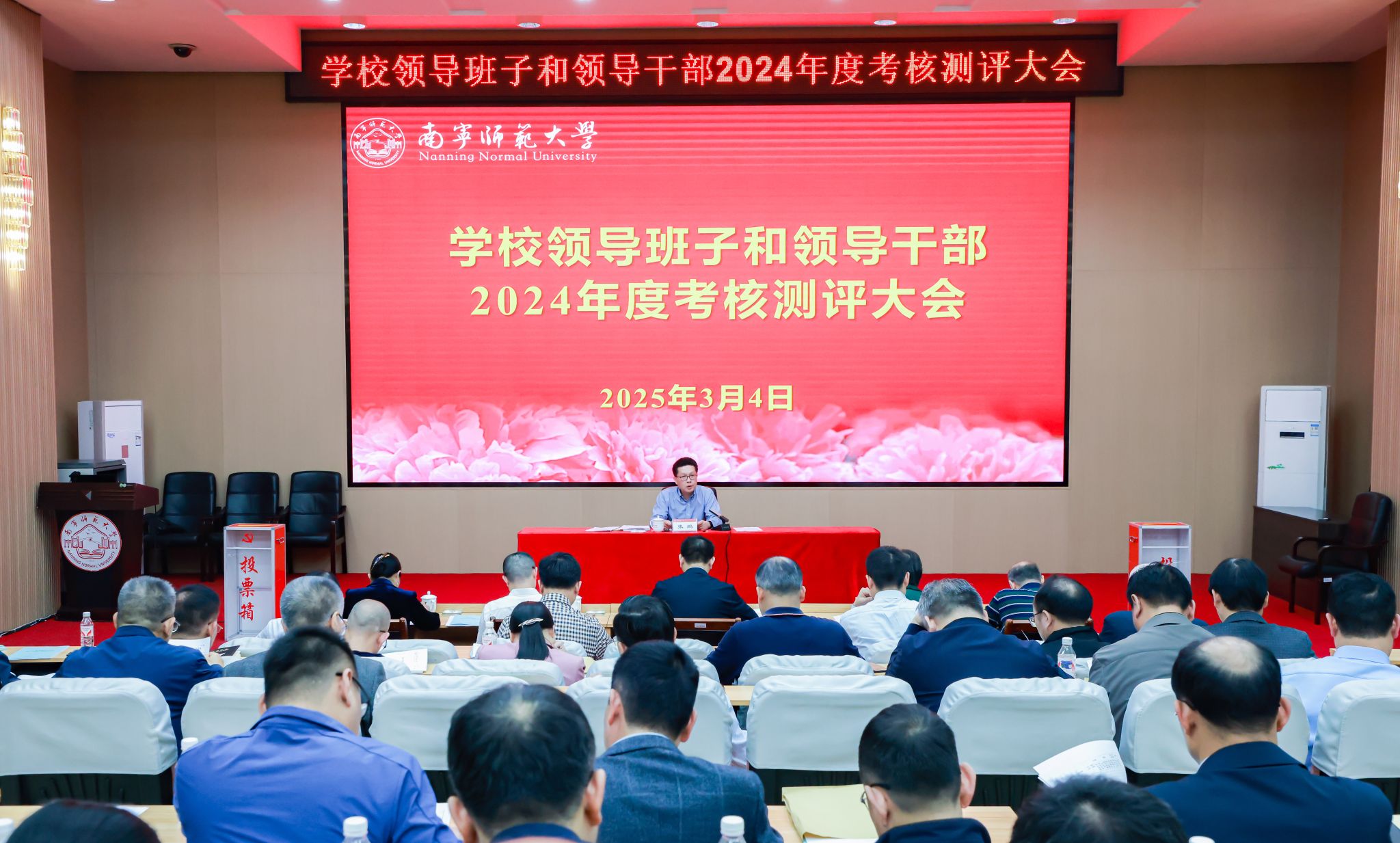 3月4日下午,开元官网在明秀校区文星楼301报告厅召开校领导班子和领导干部2024年度考核测评会议。自治区党委组织部干部五处处长李健生一行到会指导,全体在邕校领导出席考核测评会议,学校正处级领导干部、正高代表参加会议。会议由学校党委书记张鹏主持。