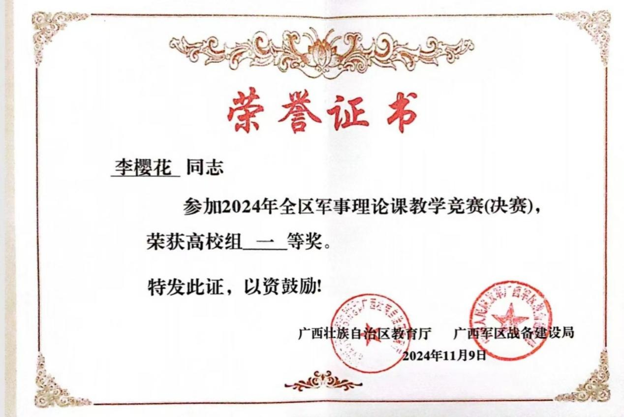 2024年全区高校军事理论课教学竞赛(决赛)由广西壮族自治区教育厅、广西军区战备建设局主办,广西师范大学、广西高校国防教育学会共同承办。大赛分为初赛和决赛两个阶段,共有211名军事理论课教师参加初赛,仅有20名教师进入高校组决赛。决赛评委从教学设计、教学内容、教学方法、教学素养等四个方面共13项内容进行综合测评。开元官网李樱花老师凭借扎实的理论基础、精湛的案例演示、严谨细致的教学风格,经过激烈角逐,最终荣获一等奖。