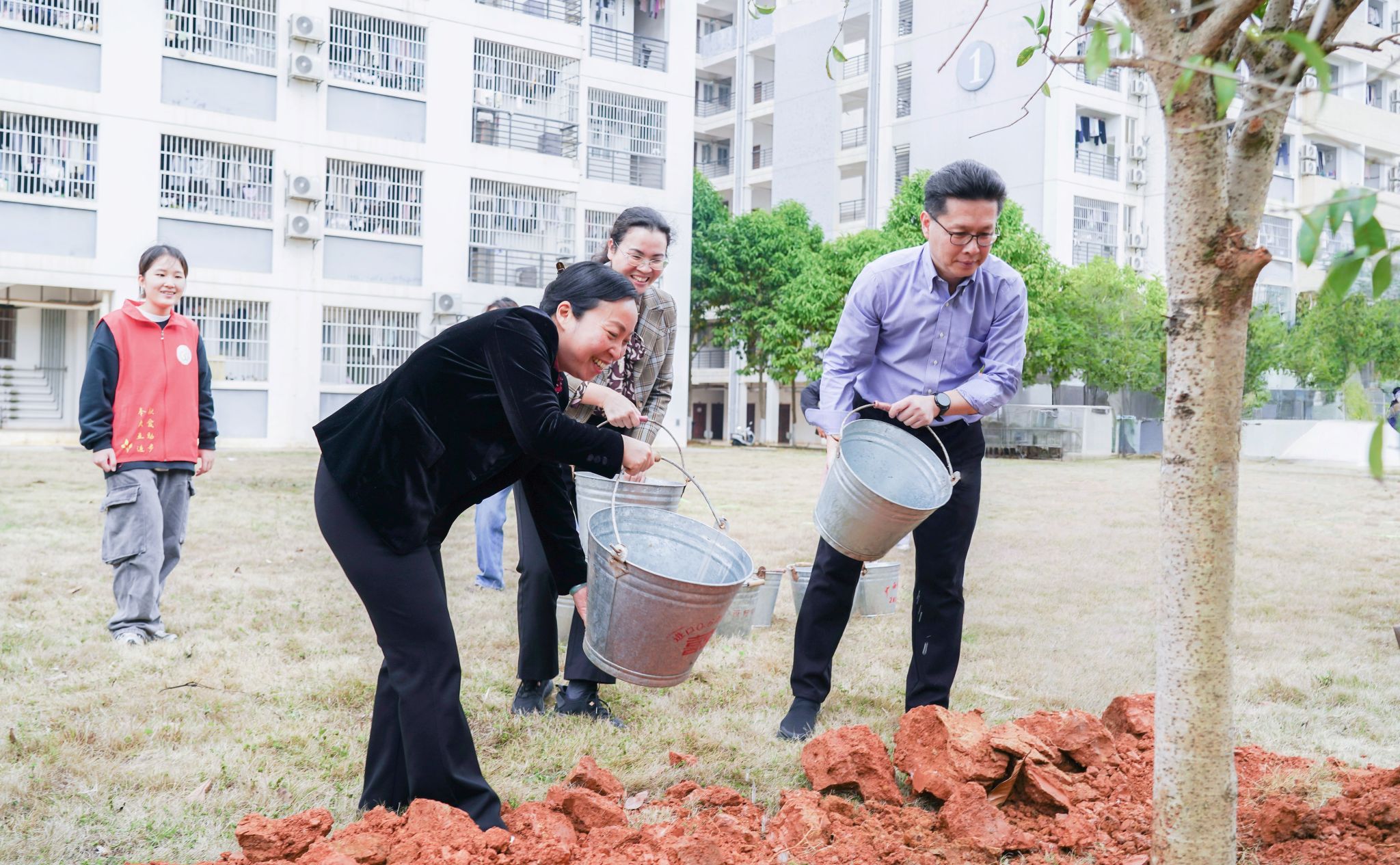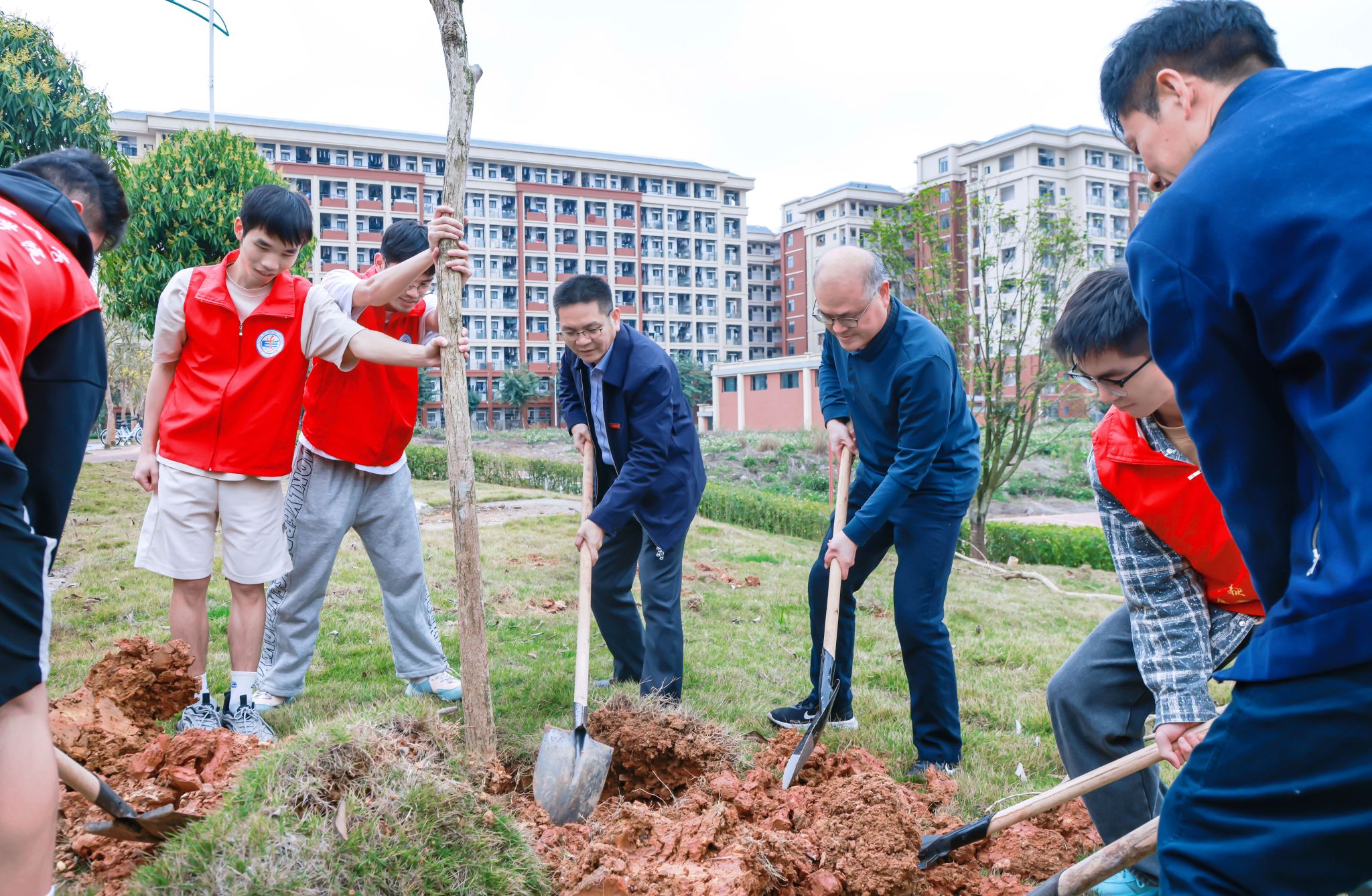 活动前期,学校积极筹备、广泛动员,招募了120余名大学生志愿者,并提前准备树苗、工具等物资,为活动顺利开展提供有力保障。在植树活动现场,学校领导老师与志愿者们一起忙碌起来,扶正树苗、挥锹铲土、培实新土、提桶浇水,大家热情高涨,分工协作,每道工序井然有序。尽管泥土沾满鞋裤、汗水浸湿衣衫,但大家脸上洋溢着幸福笑容,齐心协力种下了60株新树苗,为校园增添新绿,种下春的希望。现场同学们纷纷表示,建设美丽南师,人人有责,今后将继续参与绿色环保行动,为建设美丽校园贡献更多力量。