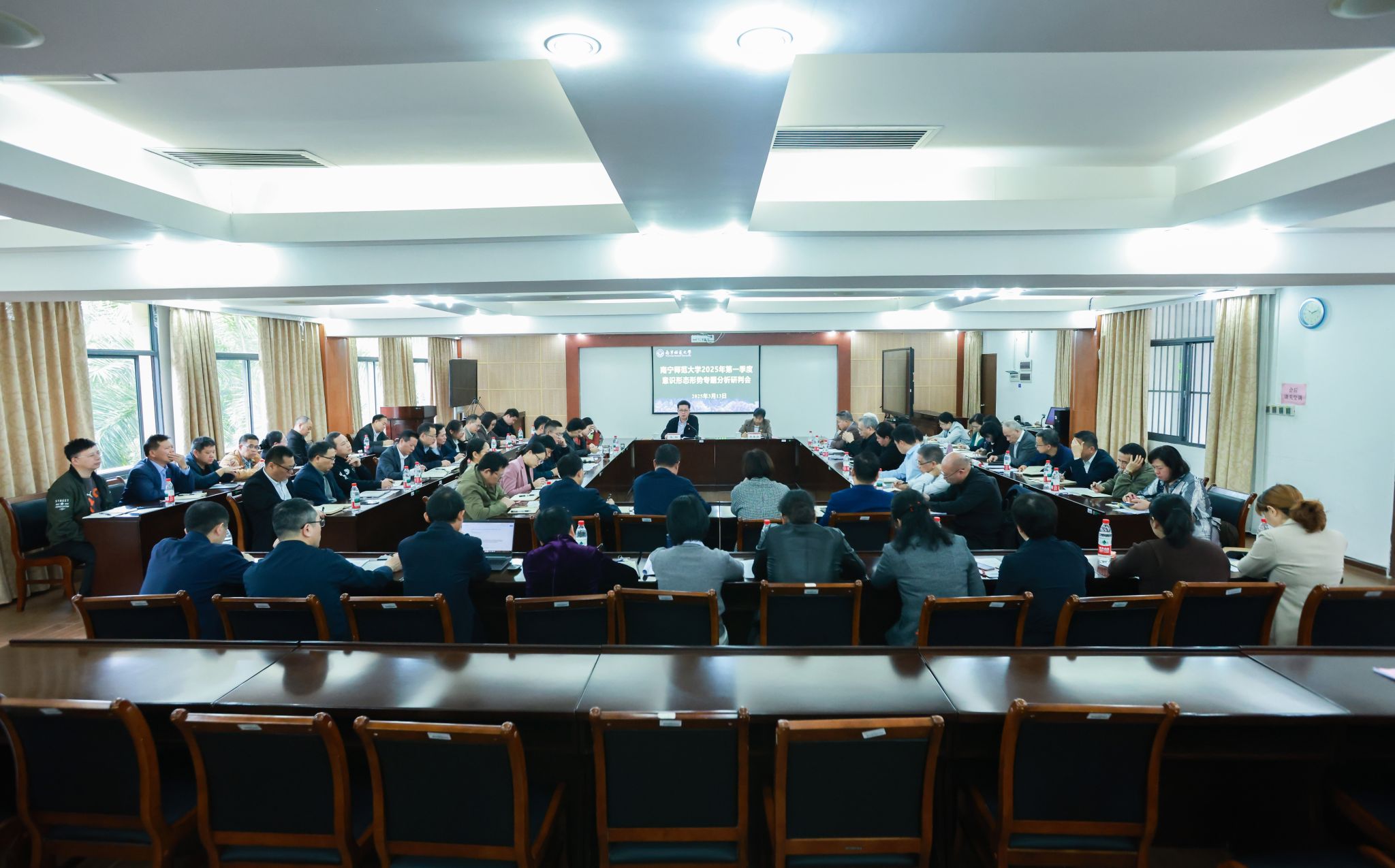 党委学生工作部(处)、保卫处、文学院、职业技术师范学院四个单位作了有关意识形态形势分析研判情况汇报。