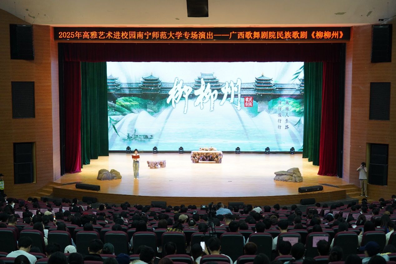 民族歌剧《柳柳州》聚焦一代宗师柳宗元在柳州度过的人生岁月,虽屡遭贬谪仕途失意,却初心不改情系苍生,坚信“官为民役”、坚持“利安元元”,实现了从“北望长安梦未休”到“我的长安是柳州”的艰难跨越和情感升华。极具张力的戏剧表达和精美的舞台布景使观众仿佛身临其境,而柳宗元的家国情怀更是通过演员们的倾情演绎直抵人心,深深打动了在场的师生。演出到精彩之处时,台下观众掌声如潮。
