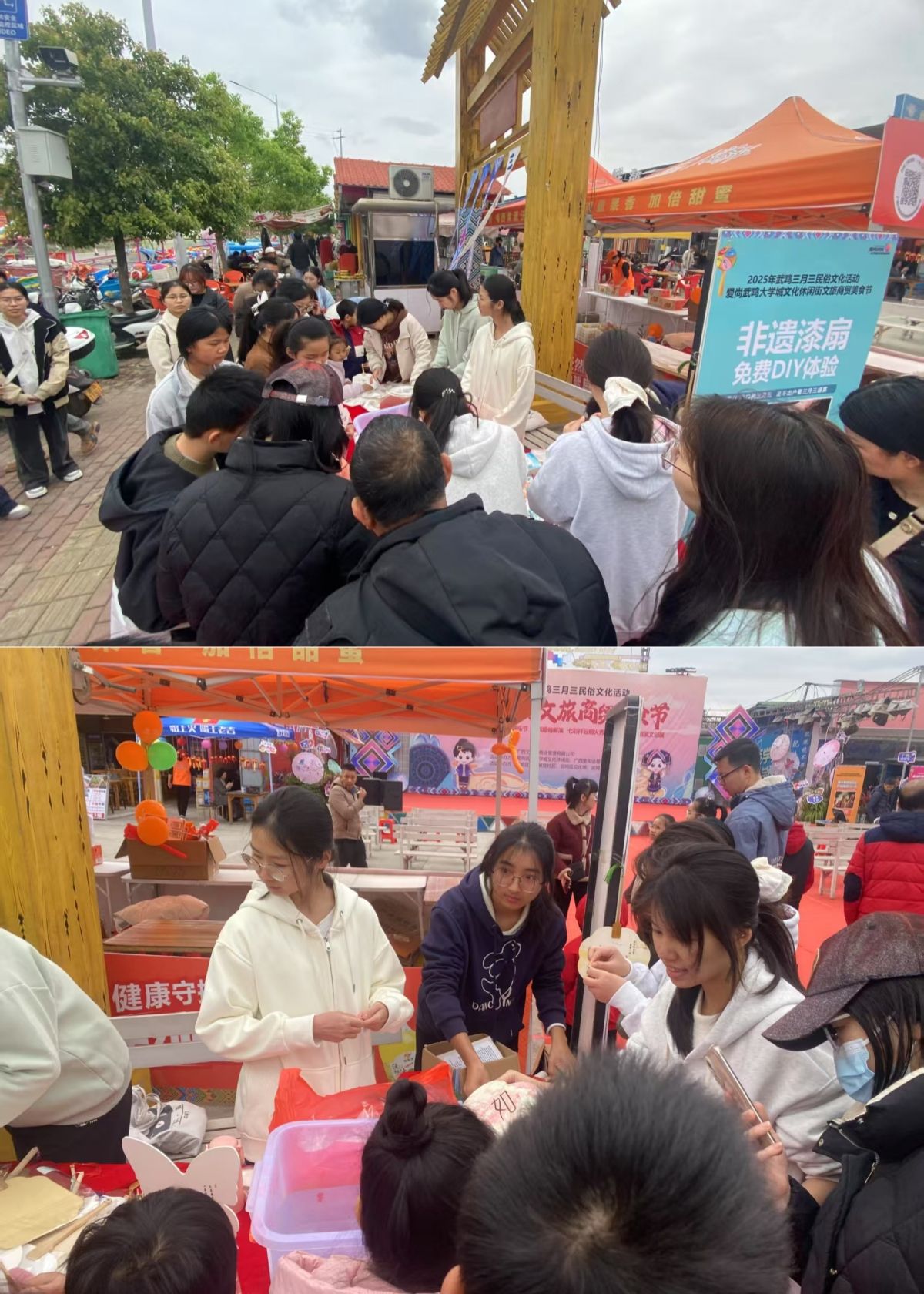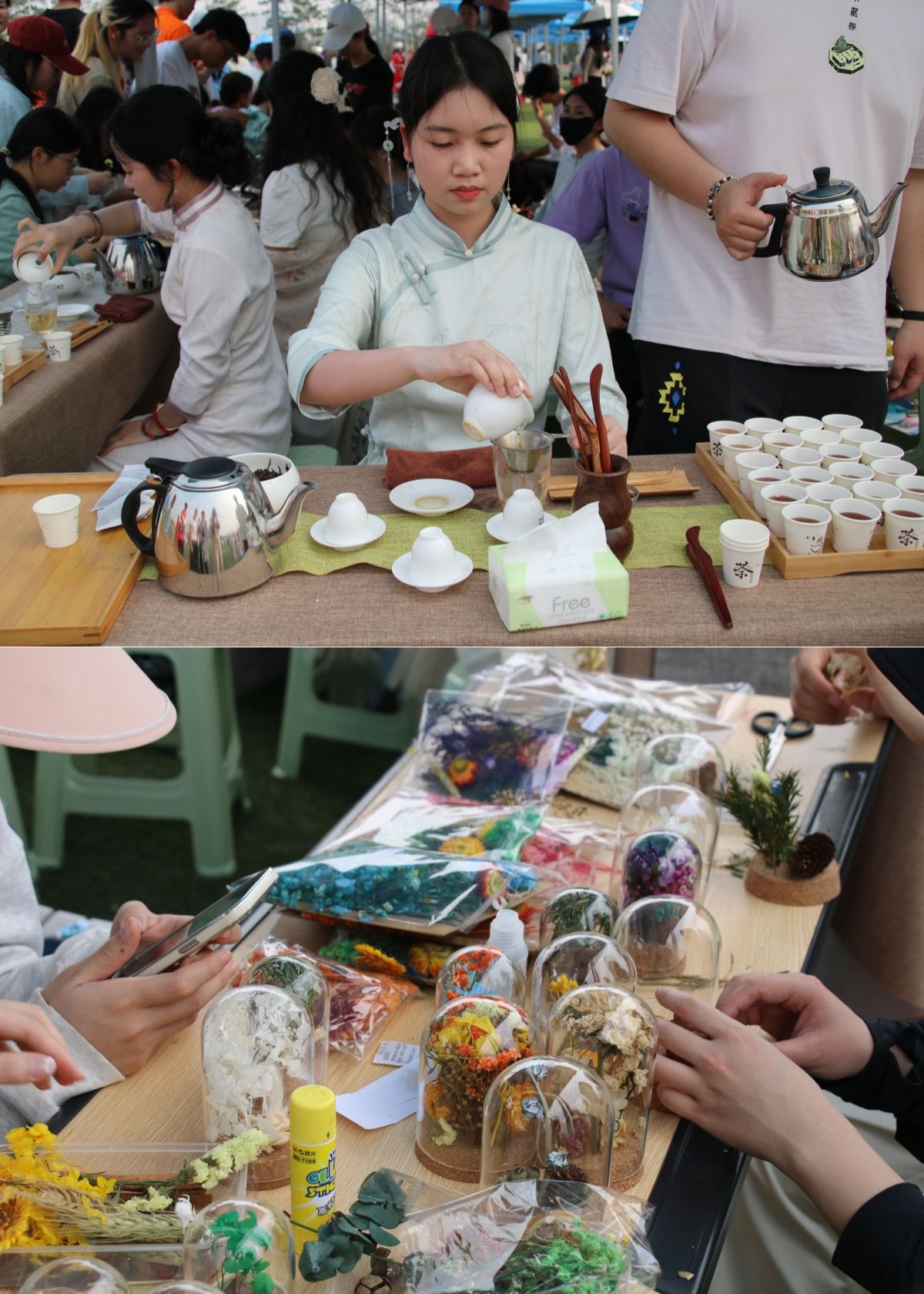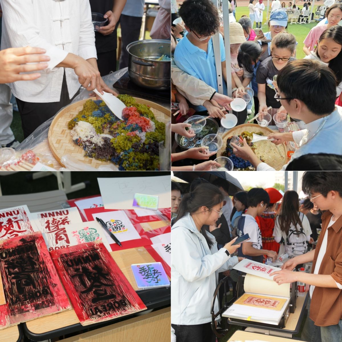 此外,各学院还结合专业特色,开展了系列展示。在武鸣校区,化学与材料学院通过生动的“火云掌”化学小实验,展示了化学反应的奇妙魅力,同时结合“五色糯米饭”染料手工艺品的制作,将传统食品文化与现代化学知识巧妙融合;地理科学与规划学院无人机飞行和天文望远镜观星展示了高空视角下的美景和白日观星的奇妙,让同学们直观感受地理科学的魅力;计算机与信息工程学院的3D打印技术、人工智能机器人等先进科技展示,增强了同学们的科技文化自豪感;旅游与文化学院茶香品茗介绍了中国传统茶文化,永生花制作和植物拓印结合了现代植物保存技术,让花朵的美丽得以永恒;美术与设计学院五色糯米饭制作,将传统工艺与色彩学原理结合;锁链绣三角香囊、碰蛋祈福以及木刻版画展现了艺术与民族文化的完美融合。在明秀校区,国际教育学院在文星楼前举办“共庆三月三,共筑民族情”活动,通过青团制作、鉴茶、抛绣球、插画、踢毽子、板鞋竞速等具有民族特色的活动,与留学生们共同感受中华文化的博大精深。