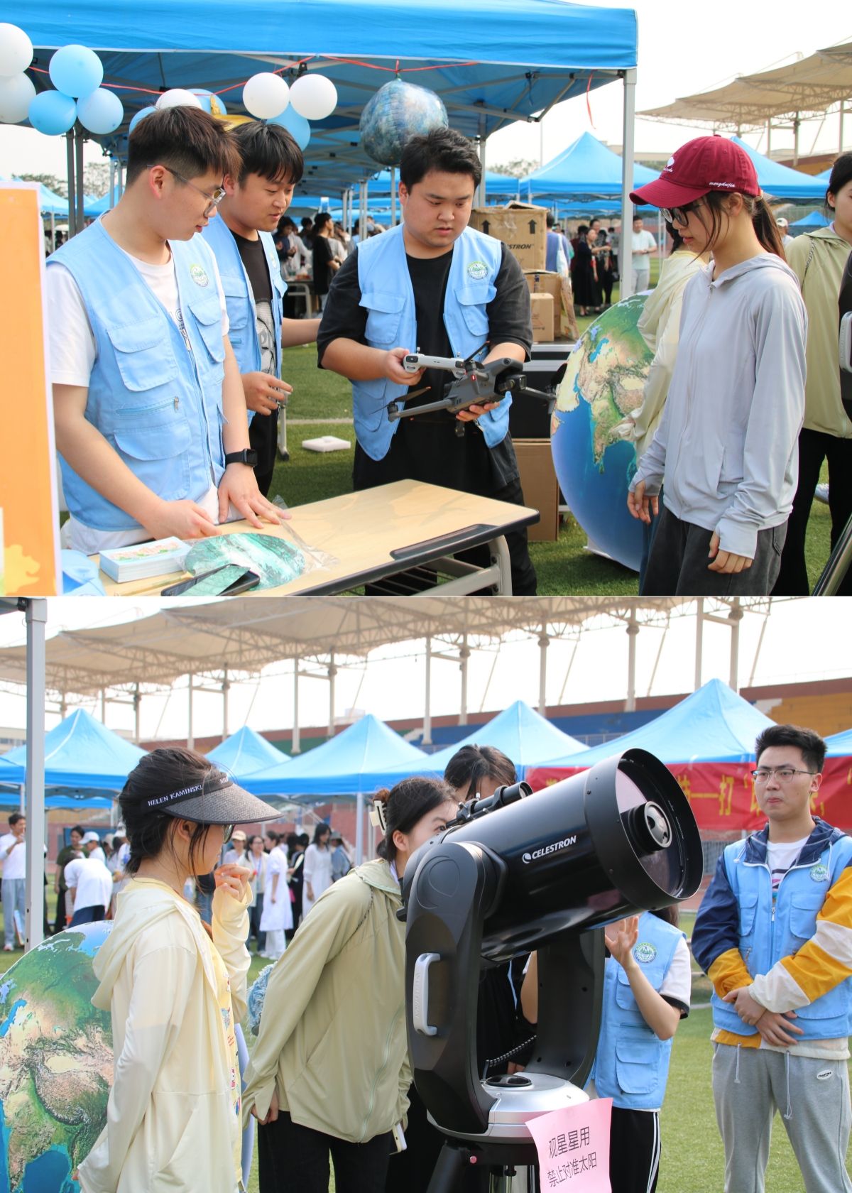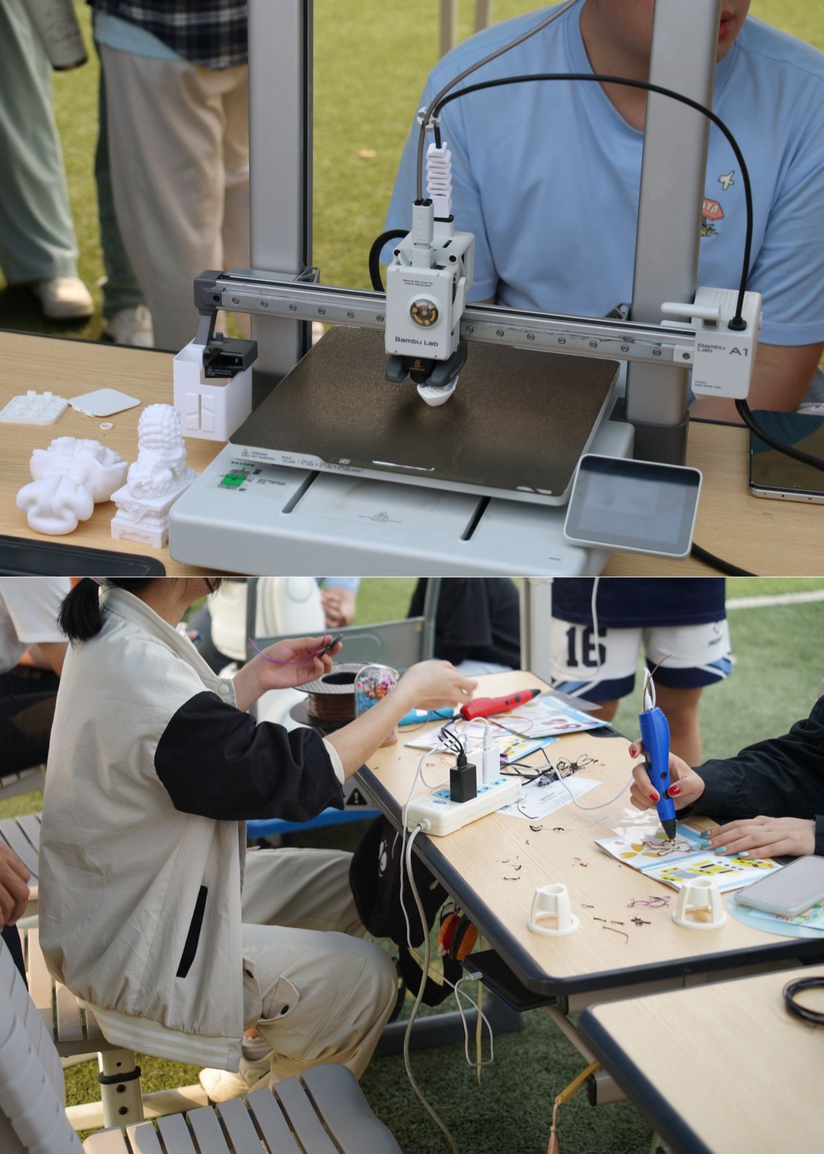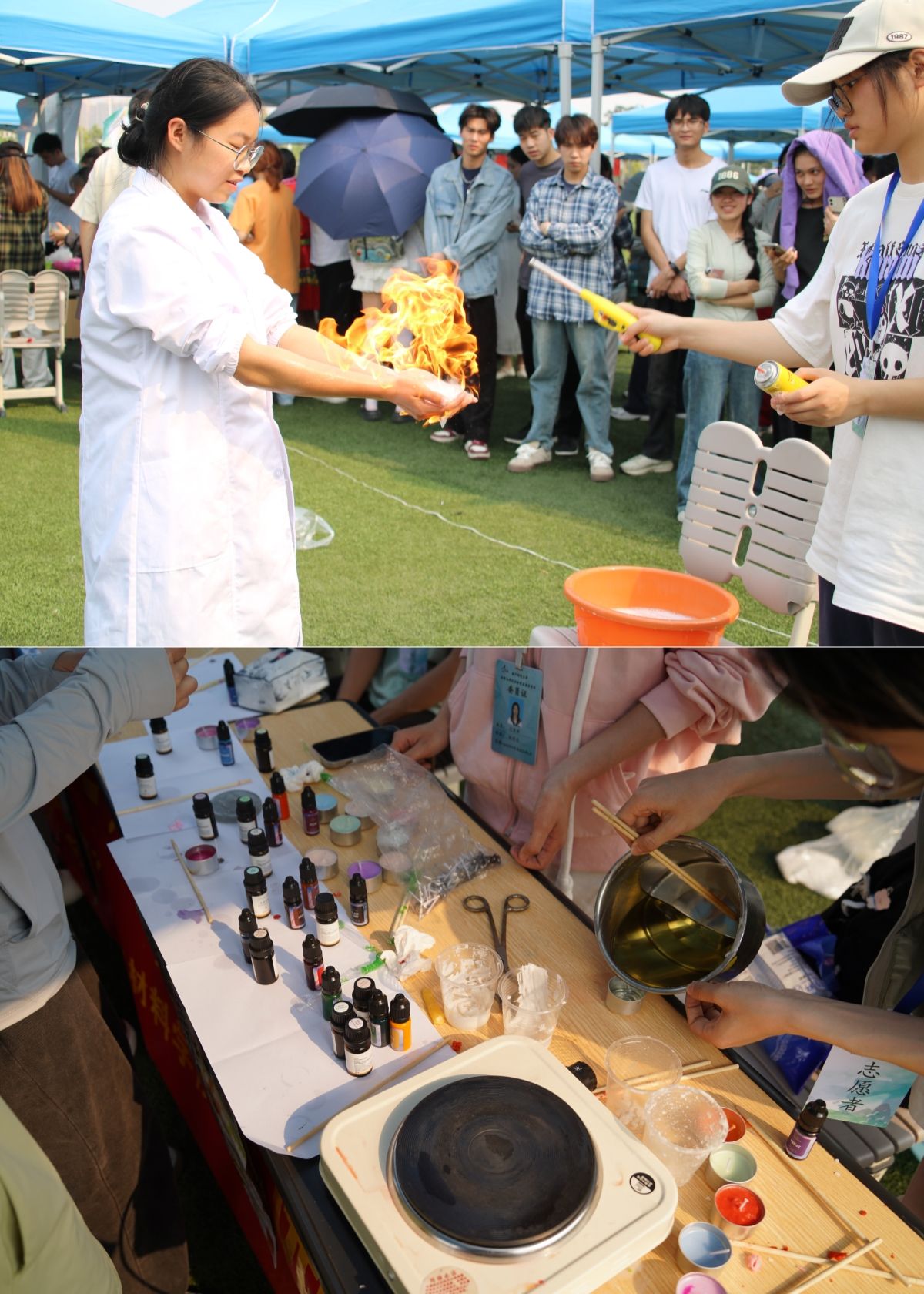 此外,各学院还结合专业特色,开展了系列展示。在武鸣校区,化学与材料学院通过生动的“火云掌”化学小实验,展示了化学反应的奇妙魅力,同时结合“五色糯米饭”染料手工艺品的制作,将传统食品文化与现代化学知识巧妙融合;地理科学与规划学院无人机飞行和天文望远镜观星展示了高空视角下的美景和白日观星的奇妙,让同学们直观感受地理科学的魅力;计算机与信息工程学院的3D打印技术、人工智能机器人等先进科技展示,增强了同学们的科技文化自豪感;旅游与文化学院茶香品茗介绍了中国传统茶文化,永生花制作和植物拓印结合了现代植物保存技术,让花朵的美丽得以永恒;美术与设计学院五色糯米饭制作,将传统工艺与色彩学原理结合;锁链绣三角香囊、碰蛋祈福以及木刻版画展现了艺术与民族文化的完美融合。在明秀校区,国际教育学院在文星楼前举办“共庆三月三,共筑民族情”活动,通过青团制作、鉴茶、抛绣球、插画、踢毽子、板鞋竞速等具有民族特色的活动,与留学生们共同感受中华文化的博大精深。