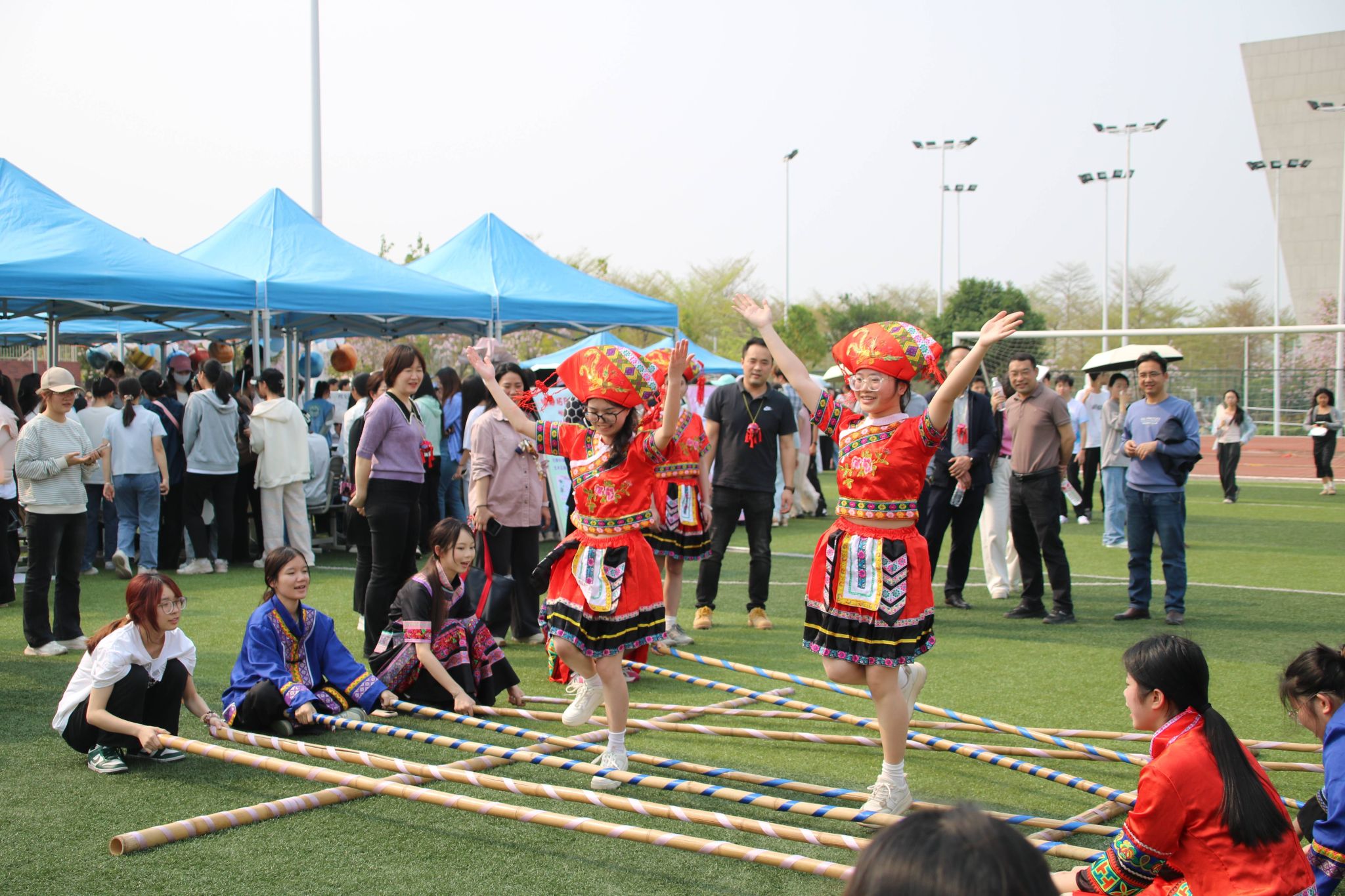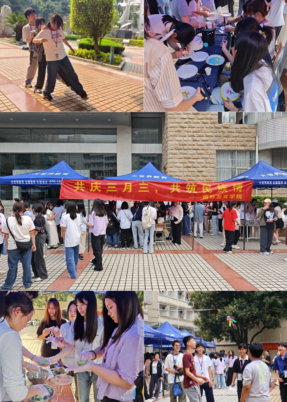 3月25日下午,学校在武鸣、五合及明秀校区分别开展“歌圩广西三月三,共铸民族石榴籽”铸牢中华民族共同体意识主题文化节系列活动,各类民族文化活动精彩纷呈。校团委联合体育与健康学院在现场设置了踩高跷、背篓绣球、两人三足、拔河比赛、蒙眼击鼓等具有民族特色和集体竞技氛围的9项民族运动项目,各学院派代表参加。大家在体育锻炼中体会民族运动的乐趣,感悟民族风情的浓厚。