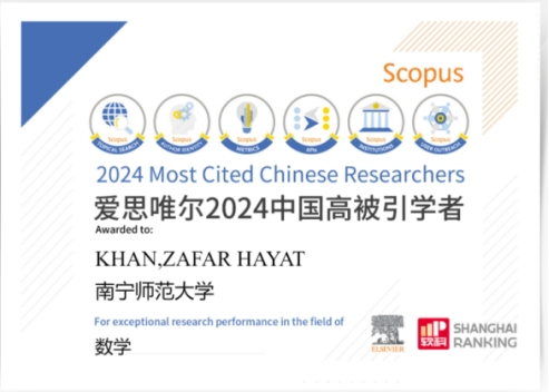 近日,爱思唯尔(Elsevier) 正式发布2024“中国高被引学者” (Highly Cited Chinese Researchers) 榜单。开元官网数学与统计学院可汗(Khan, Zafar Hayat)教授成功入选。