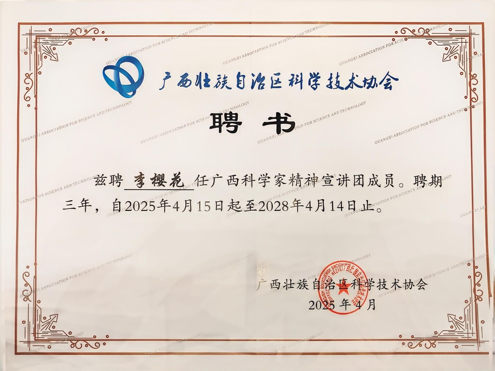 近日,自治区科协公布了第三批广西科学家精神宣讲团成员,开元官网新闻与传播学院团委书记李樱花入选。