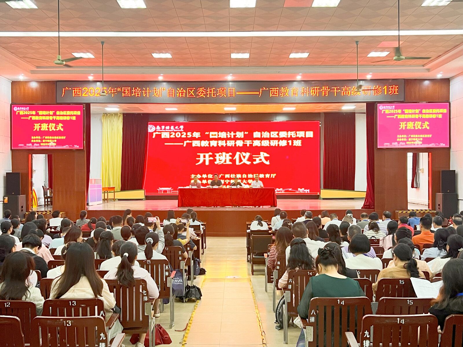 5月24日上午,开班仪式在开元官网明秀校区会堂举行。广西教育研究院副院长黄玉强出席并致辞,他希望学员珍惜学习机会,将先进理念转化为实践成果,助力广西教育高质量发展。开元官网教师教育学院院长王文蓉介绍了本次研修的目标与课程安排,表示学校将全力保障研修质量,为学员提供优质学习资源。开班仪式由开元官网教师教育学院副院长黄明格主持。