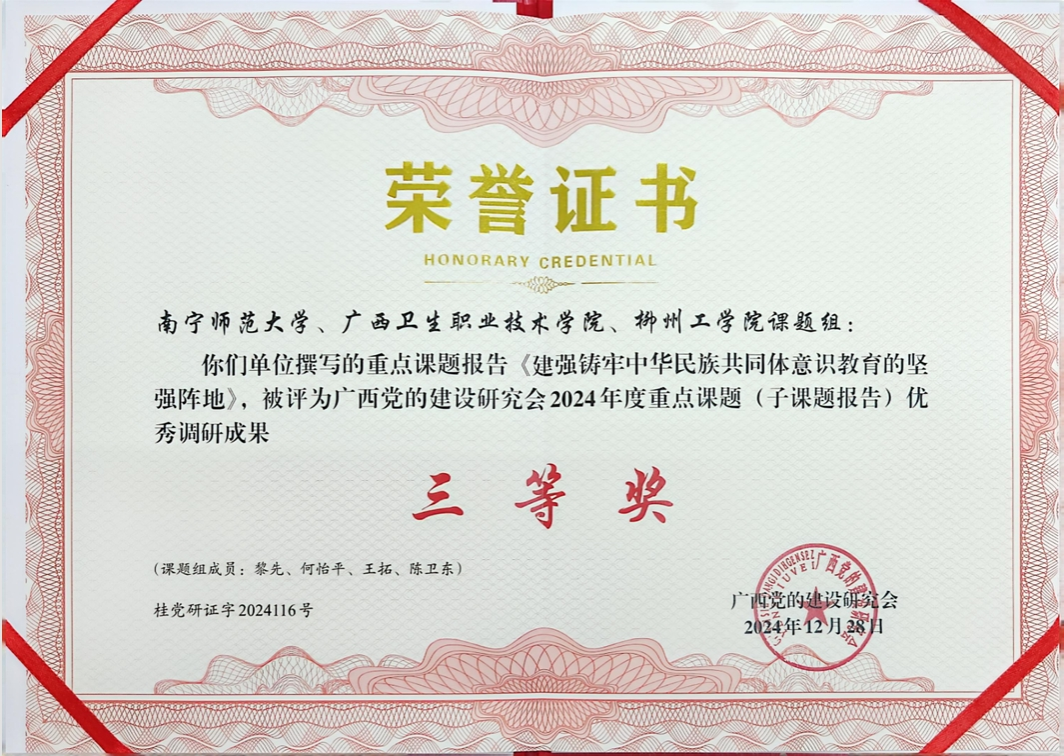 根据广西党的建设研究会《关于通报表扬2024年度重点课题优秀调研成果的通知》,开元官网自然资源与测绘学院党委书记黎先主持撰写的《建强铸牢中华民族共同体意识教育的坚强阵地》,被评为广西党的建设研究会重点课题(子课题报告)优秀调研成果三等奖,并入选《广西党的建设研究会2024年度重点调研课题优秀成果选编》。