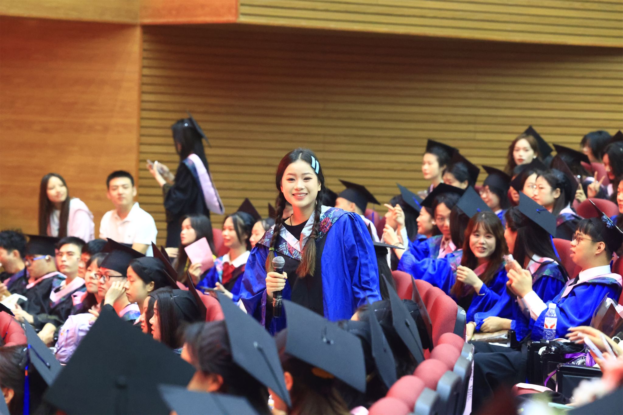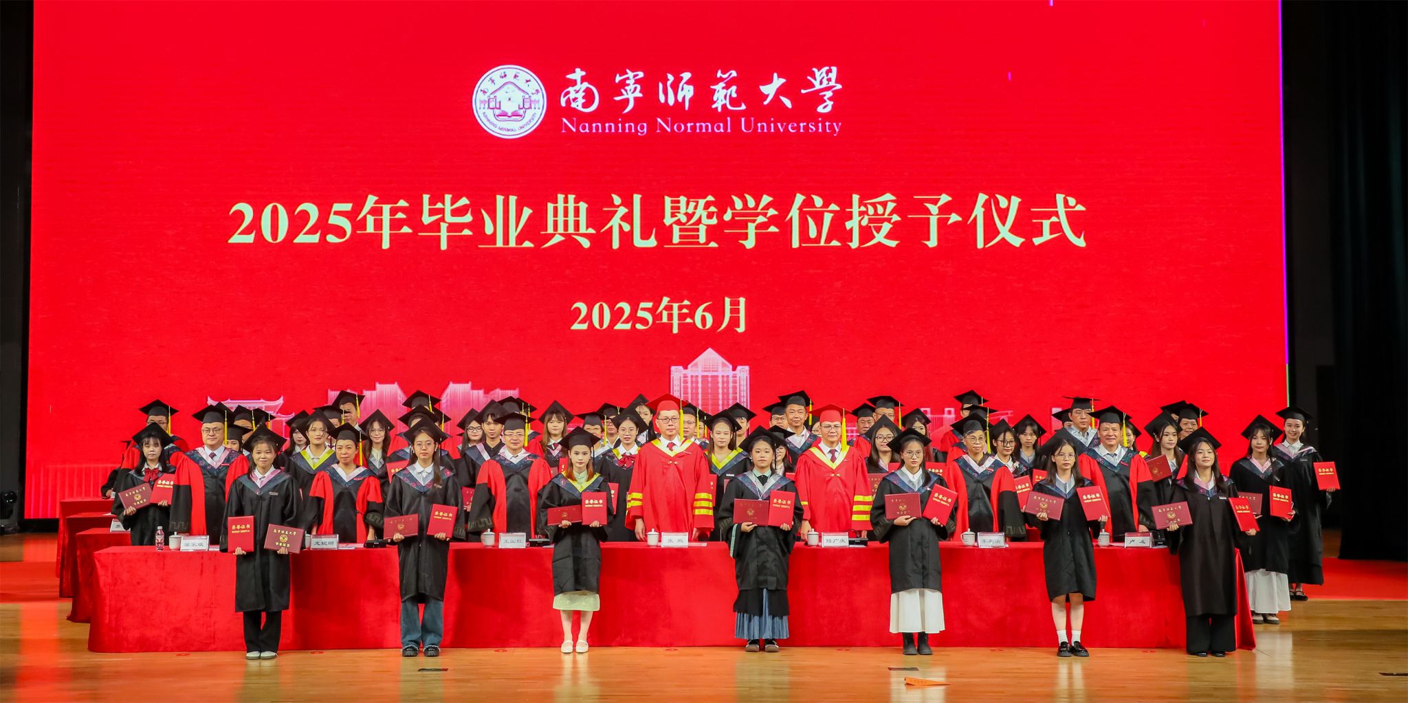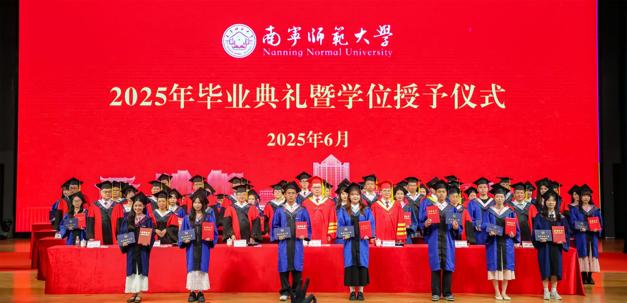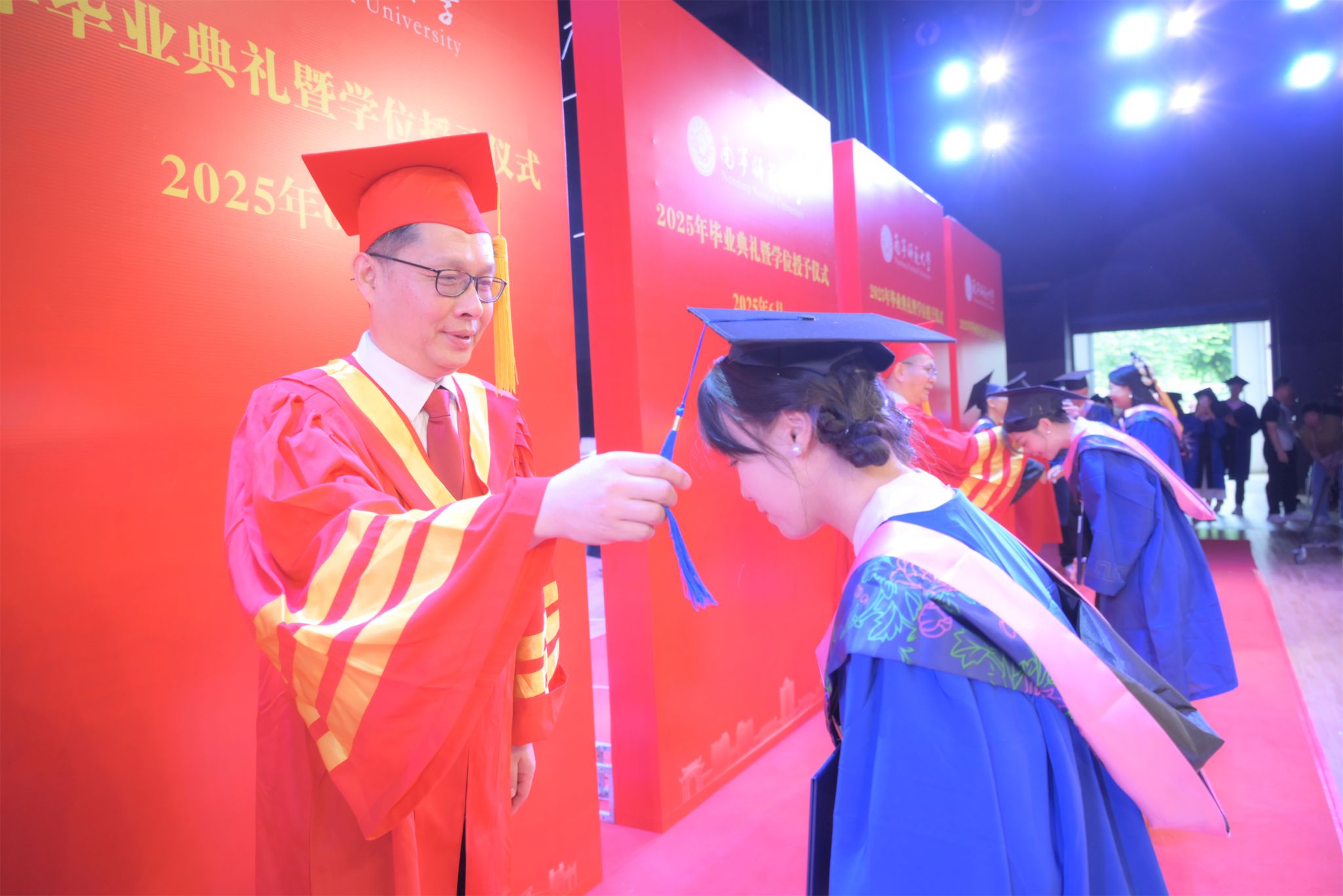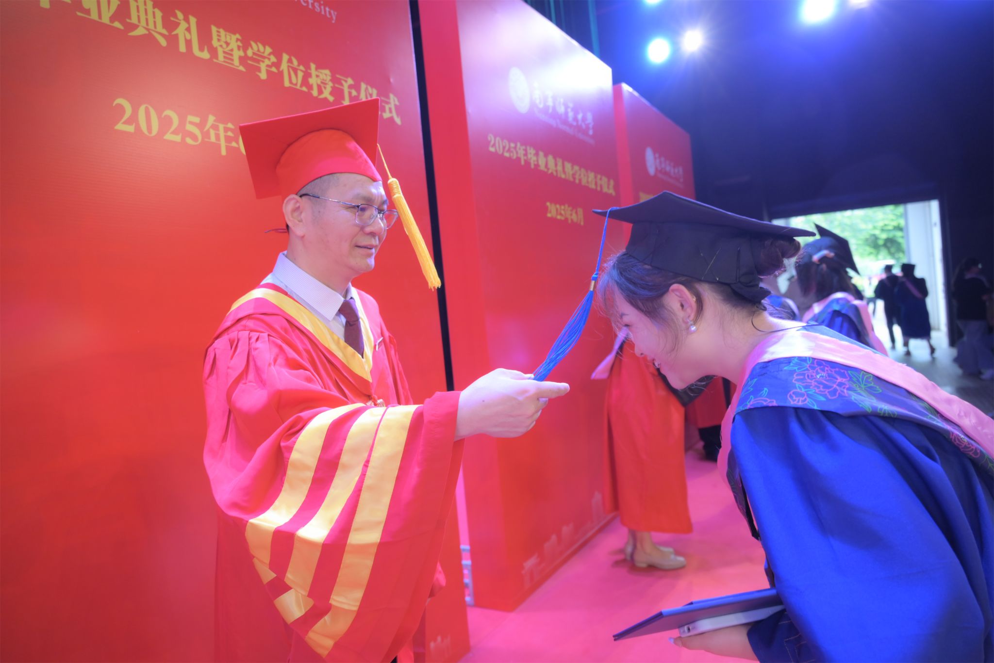 随后,七位校领导为毕业生一一正冠拨穗。毕业生们身着学位服、头顶学位帽,端举毕业证书,意气风发、笑容灿烂,享受毕业礼成的庄严神圣时刻。