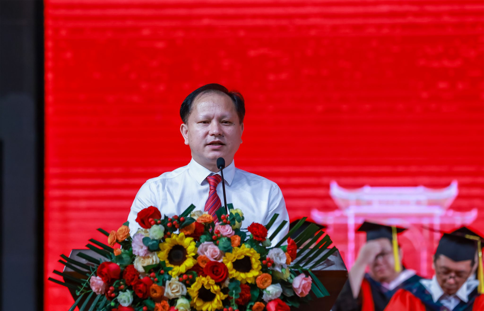 隆广庆校长代表学校向2025届全体毕业生送上最热烈的祝贺和最美好的祝福。他用“SEEK”这四个字母寄语毕业学子:一是Self-awareness(自我认知)。知道自己是谁,知道自己需要什么,知道自己要往哪里去。二是Empower(赋能)。学会自我赋能,不断提升自己的能力,拓宽认知边界;懂得为他人赋能,在团队协作中分享经验、激发潜能。三是Exploration(探索)。立足本职岗位,在看似平凡的工作中实现“微创新”,以涓滴之水积成江河,汇聚成滔滔洪流奔涌向前。四是Keep(坚守)。坚定“强国有我”的使命担当,把服务社会、报效国家、振兴民族、贡献人类的“大我”,与个人的兴趣热爱、生活理想、职业追求的“小我”深度融合,永葆初心,为人民担当、为家国担当。