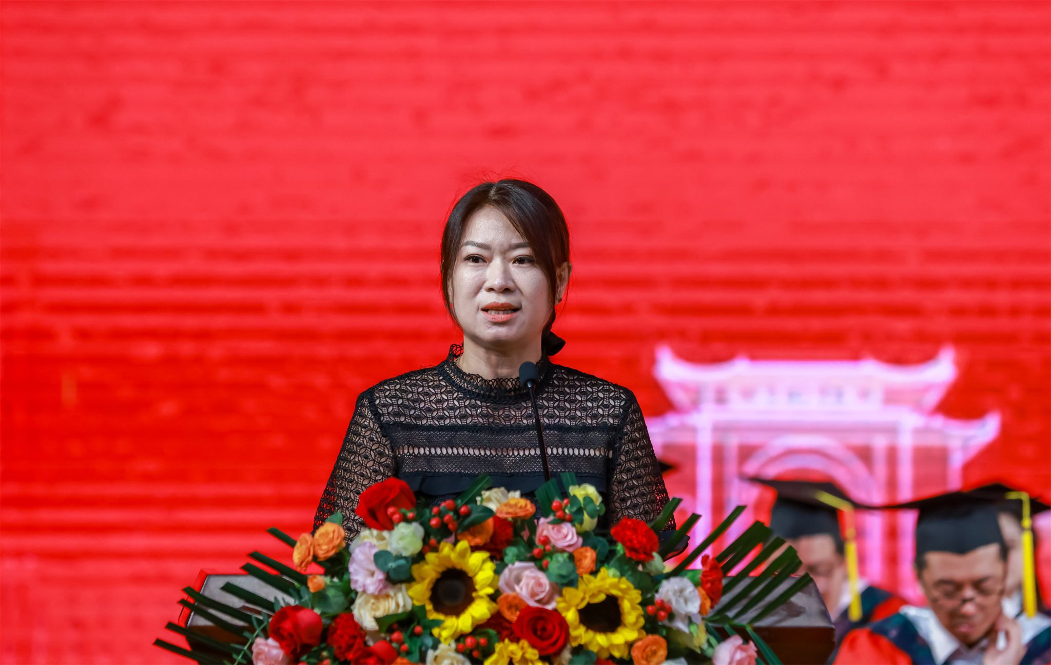 人工智能学院李京鸽的母亲吕颖女士作为家长代表发言。她回顾了孩子大学四年的成长变化,感谢学校与老师的精心培育,希望孩子们永远铭记母校的培育之恩,带着母校给予的力量和荣光,服务社会、报效国家。