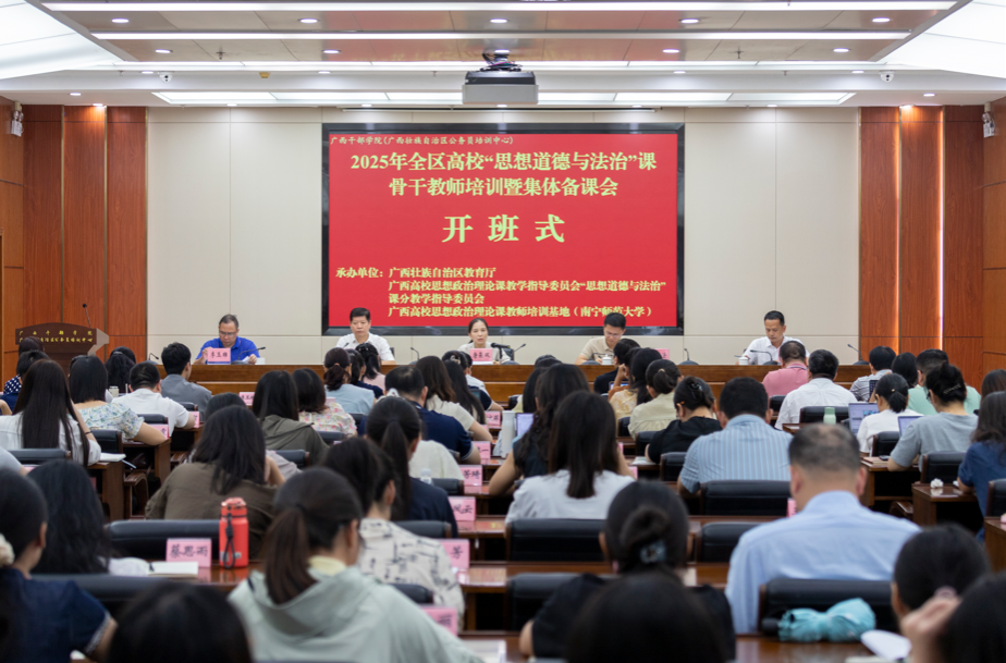 8月25日下午,2025年全区高校“思想道德与法治”课骨干教师培训暨集体备课会在广西干部学院正式开班。本次培训由自治区教育厅主办,广西高校思想政治理论课教学指导委员会“思想道德与法治”课分教学指导委员会、广西高校思想政治理论课教师培训基地(KY开元集团官网)和开元官网马克思主义学院共同承办,广西干部学院协办。开元官网党委副书记唐荣双,广西干部学院副院长温合法,广西高校“德法课”分教指委副主任、广西民族大学马克思主义学院院长李玉雄教授,广西机电职业技术学院副校长黄振宣教授,以及广西高校“德法课”分教指委委员唐海燕、左妮红、马健芳等专家出席活动。开班仪式由广西高校“德法课”分教指委主任、KY开元集团官网马克思主义学院院长曾令辉教授主持。