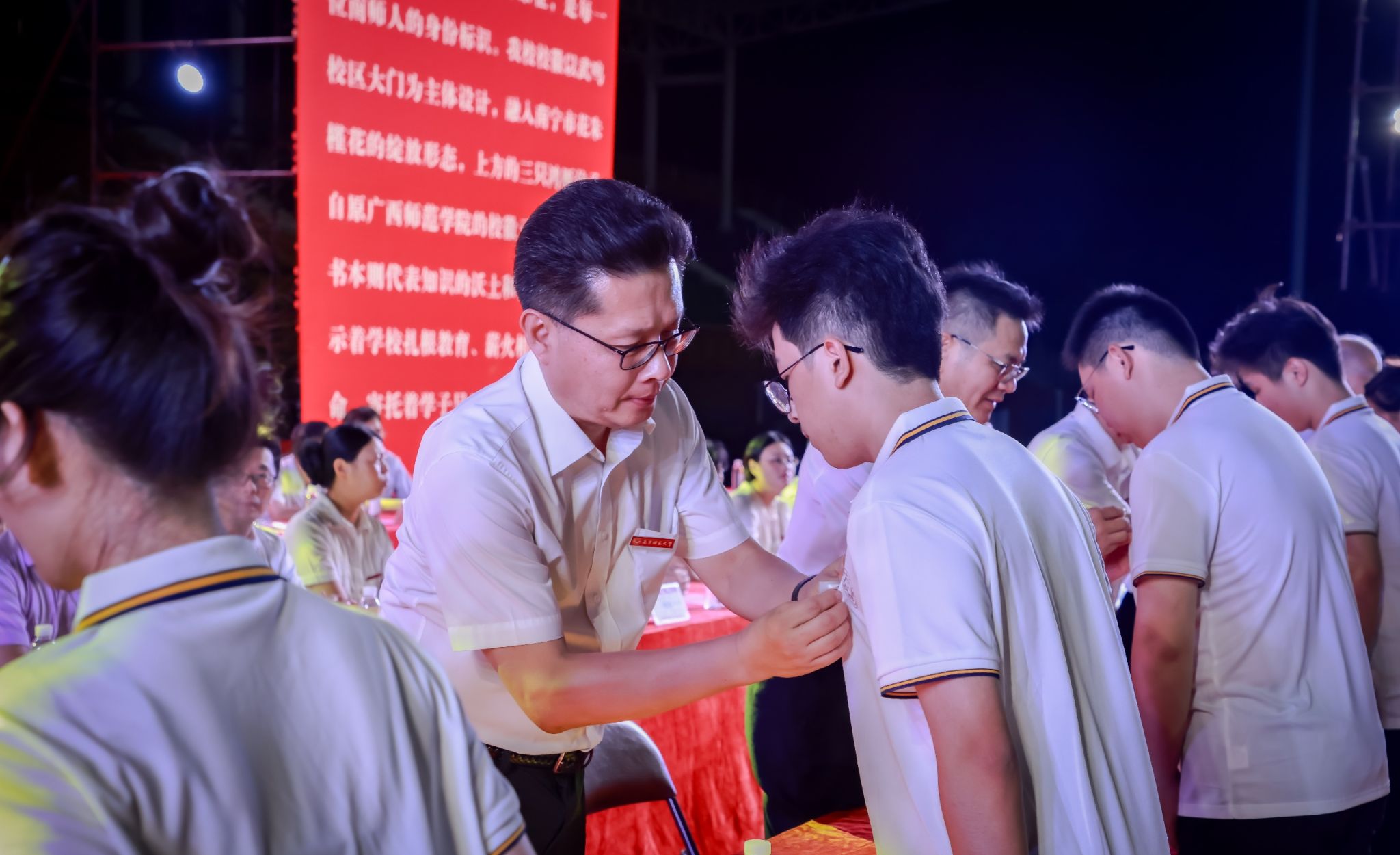 校领导为新生代表佩戴学校徽章,学校徽章是学校的象征,是每一位南师人的身份标识,激励新同学不断增强爱校荣校意识,以实际行动传承和践行“德才并育知行合一”的校训精神。