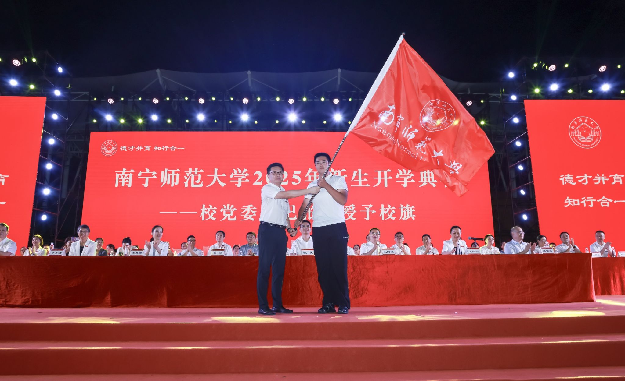 学校党委书记张鹏为新生代表授予校旗,希望同学们弘扬“学高为师 身正为范”的崇高校风,与学校同心同行,让校旗所承载的精神在代代学子的奋斗中永续光芒。全体新生进行庄严宣誓,铮铮誓言表达了2025级新同学恪守校训校风、奋发成才的决心。