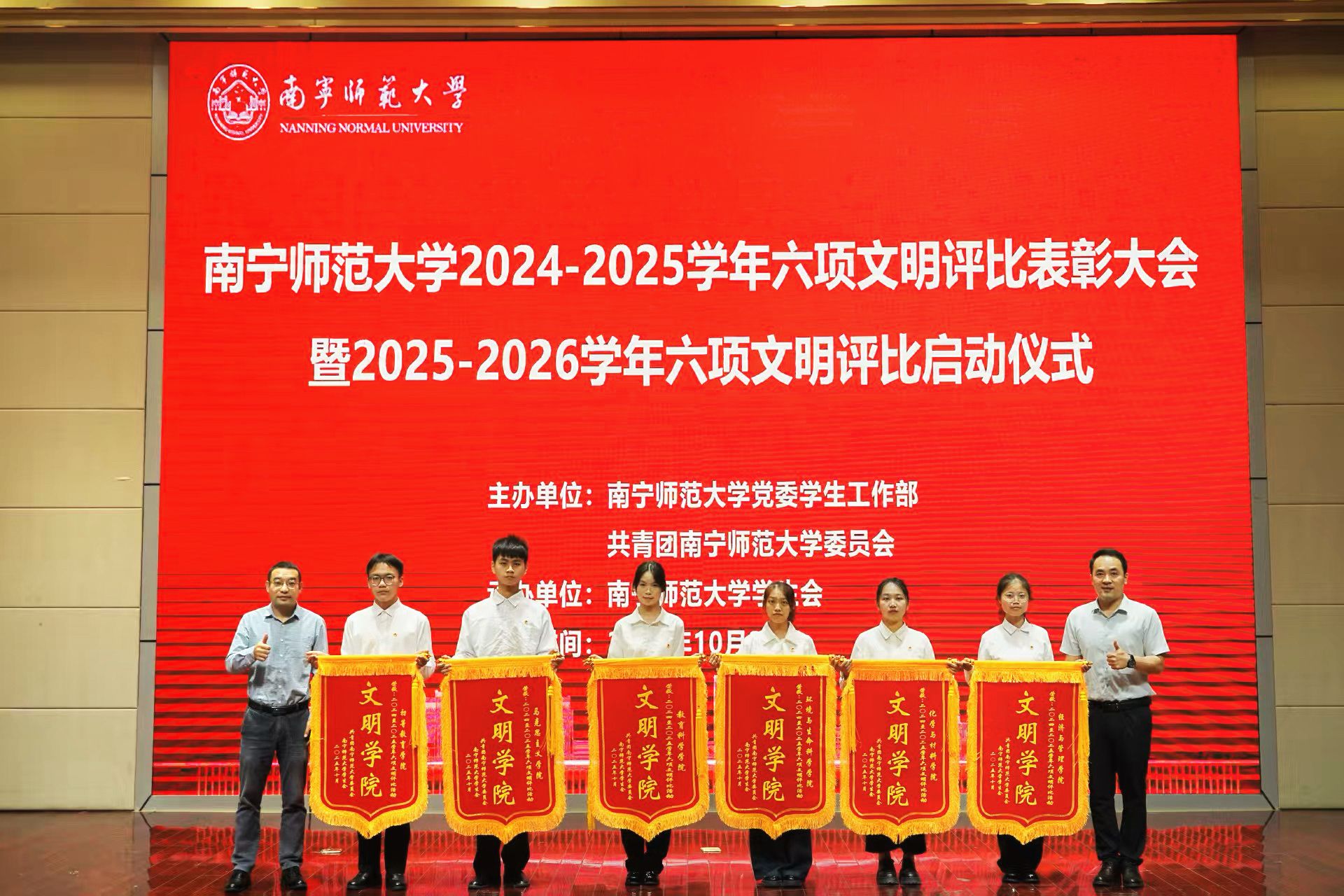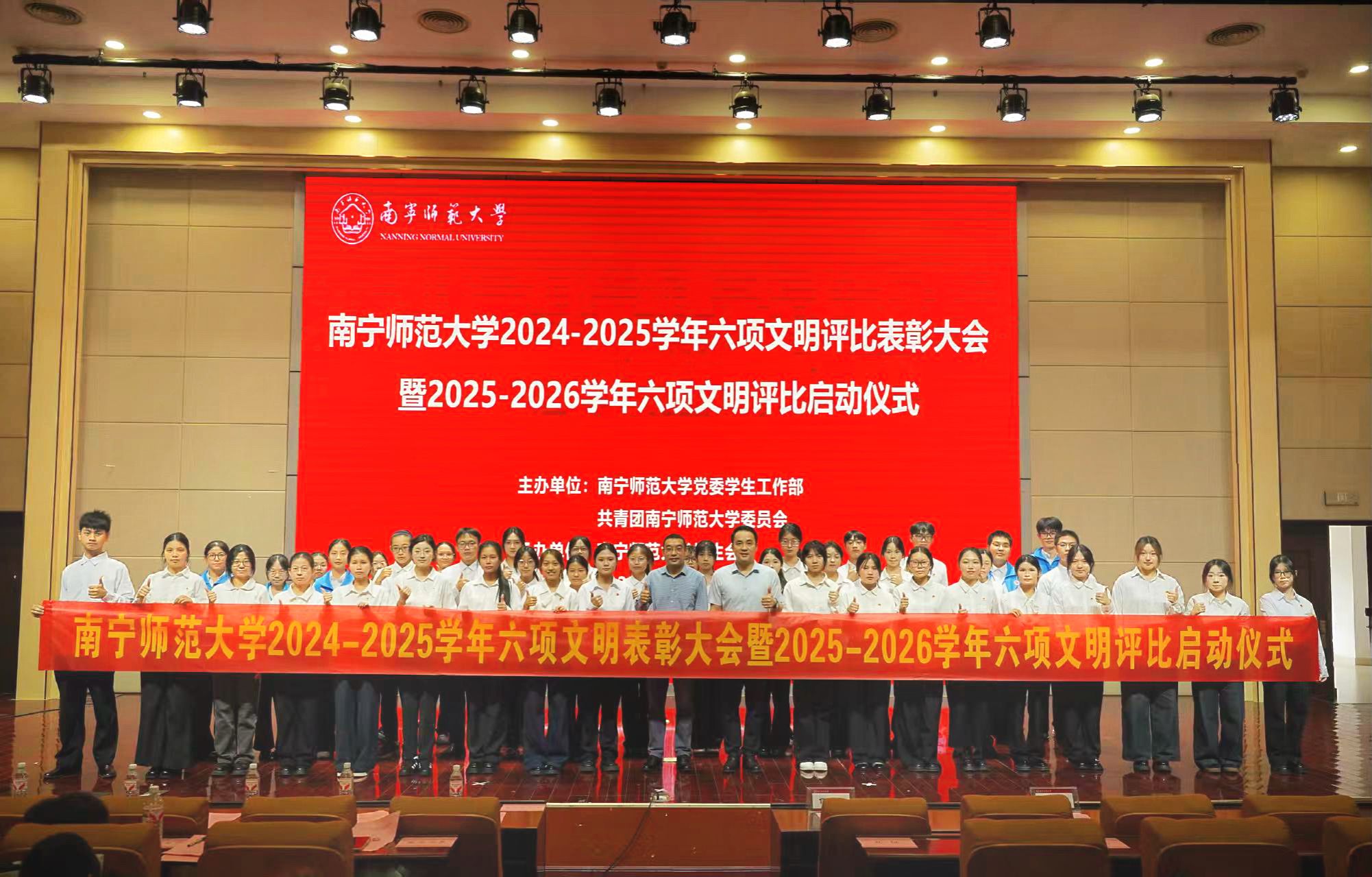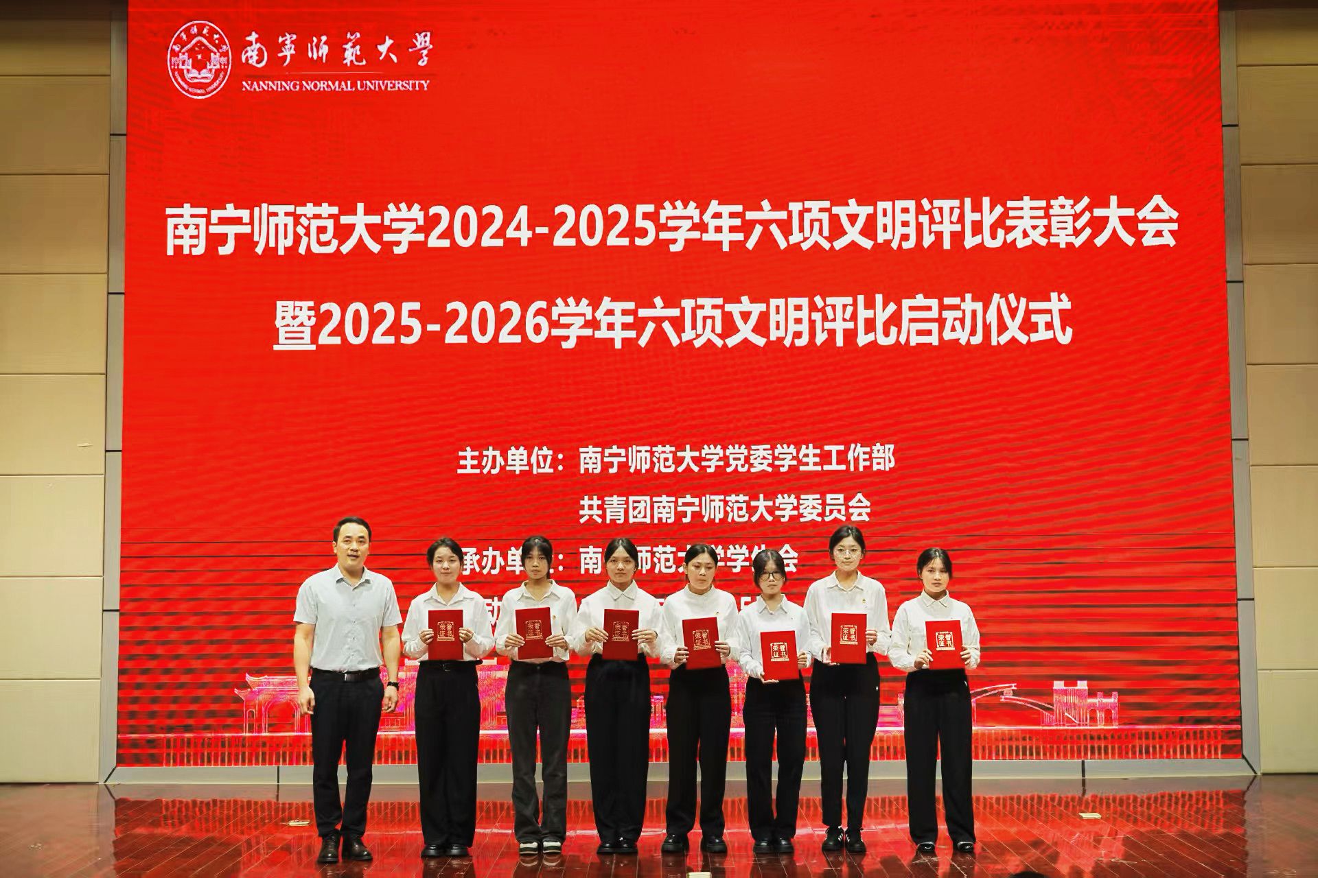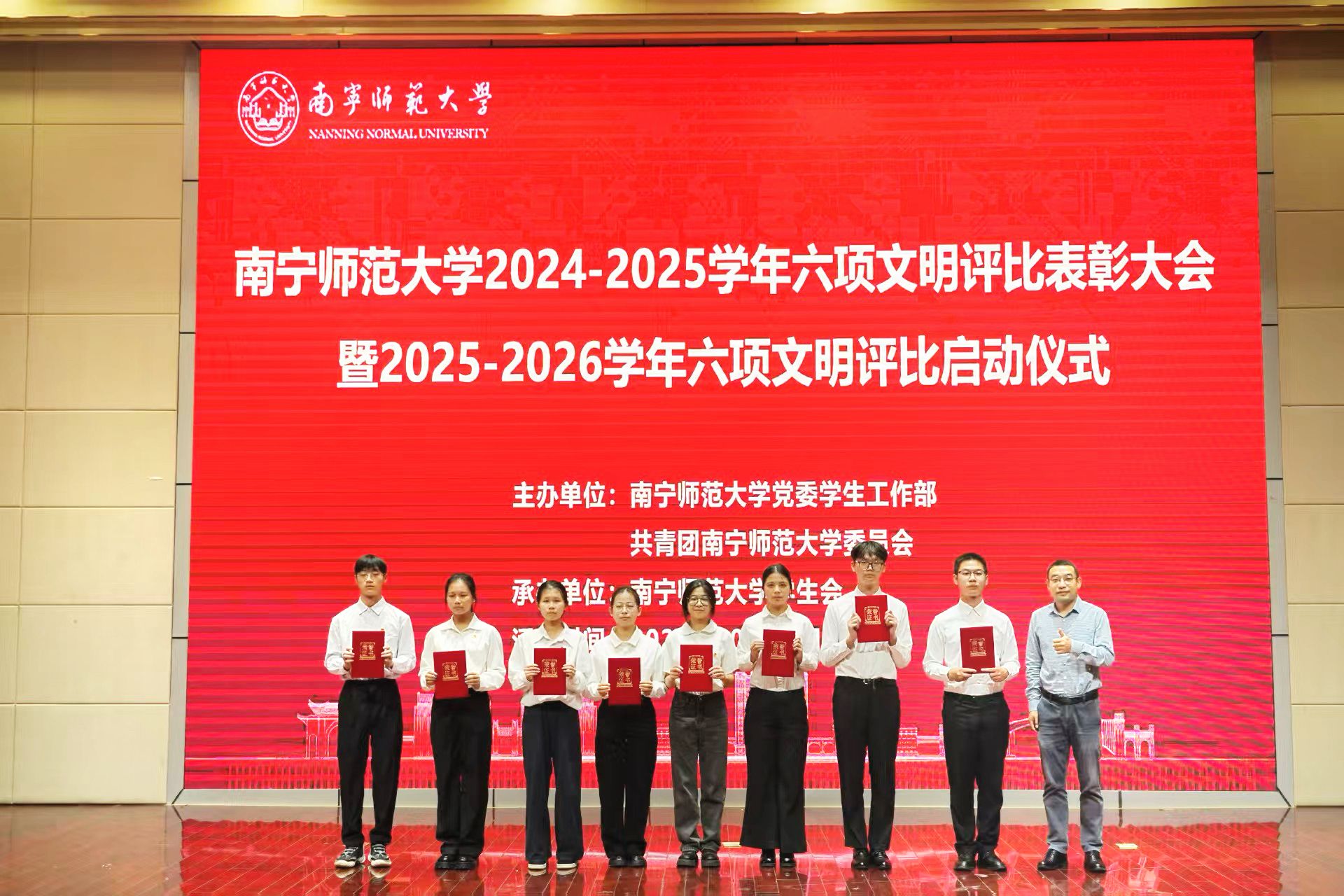 随后,党委学生工作部、校团委负责人分别为荣获2024-2025学年六项文明评比“先进个人”“文明班级”“文明学院”的代表颁奖。党委学生工作部副部长何健呼吁同学们提升文明意识、发挥主体作用,为建设文明南师添砖加瓦。校团委副书记何俊斌在讲话中充分肯定过往成效并提出三点期望:一是深化价值引领,筑牢文明根基;二是优化协同机制,汇聚创建合力;三是强化主体意识,激发内生动力。