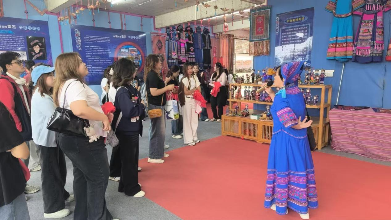 活动前,同学们还参观了覃签非遗传承基地。这不仅为国际学生提供了一个沉浸式体验广西本土非遗项目的宝贵机会,也搭建了一个中泰青年文化交流的直观平台。通过亲身体验,留学生们对中国的节庆文化、民俗风情有了更深入的认识。