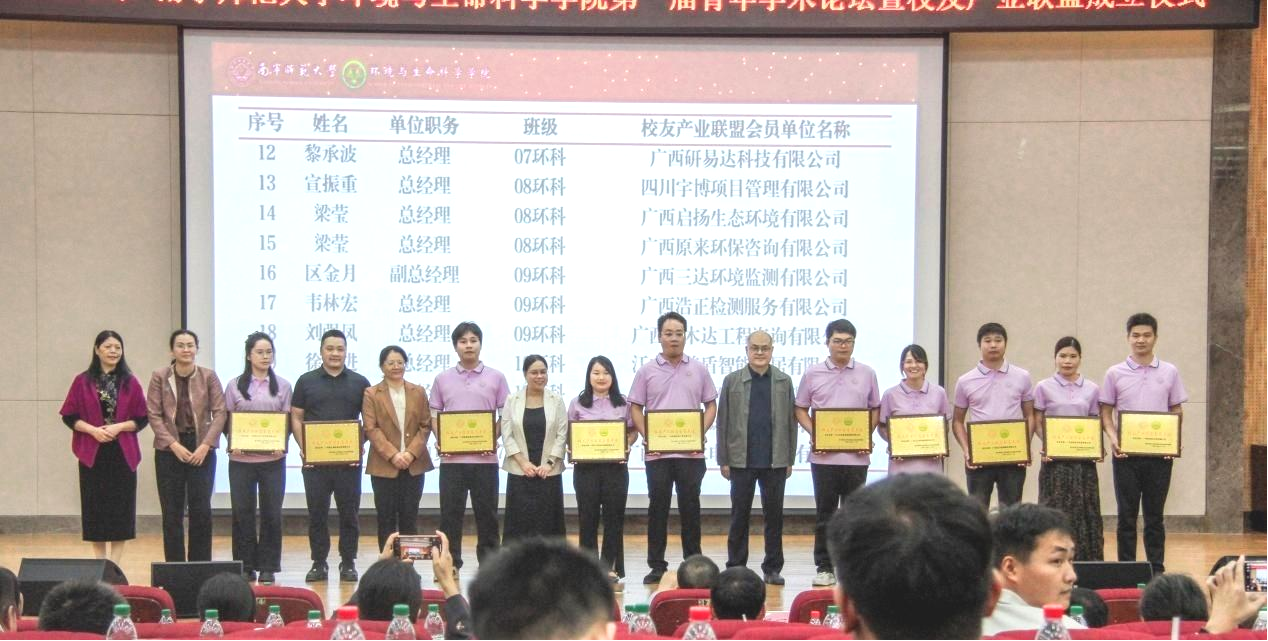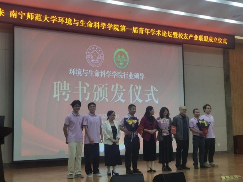 在学院和校友们的共同努力下,环境与生命科学学院产业联盟成立,共有22家校友公司成为了首批校友产业联盟会员单位。参会领导为校友产业联盟会员单位代表进行授牌。同时为加强校企协同育人,学院特聘请广西柳州钢铁环保有限公司总经理龙顺红、广西环境保护科学研究院大气环境研究中心副主任(主持工作)毛敬英博士、广西博环环境咨询服务有限公司副总经理张荣海博士等三位杰出校友担任资源与环境专业硕士生导师,大会为三位硕导颁发了聘书。