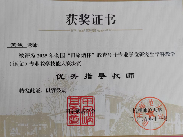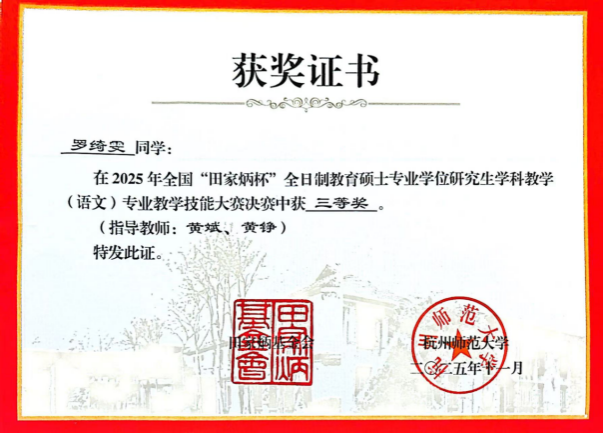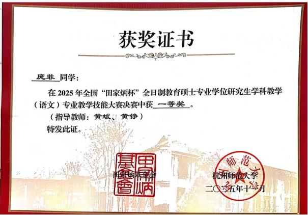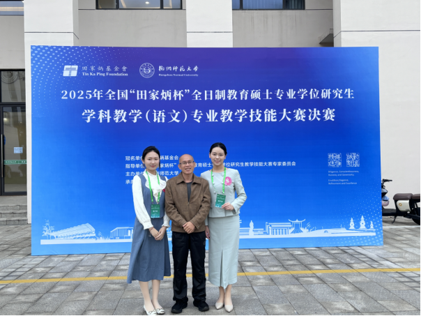 11月7日至9日,2025年全国“田家炳杯”全日制教育硕士专业学位研究生学科教学(语文)专业教学技能大赛决赛在杭州师范大学举行。开元官网2024级学科教学(语文)专业研究生庞菲、罗绮雯凭借扎实的专业功底和出色的赛场表现脱颖而出,分别荣获国家级一等奖、三等奖,黄斌老师获评“优秀指导教师”称号。