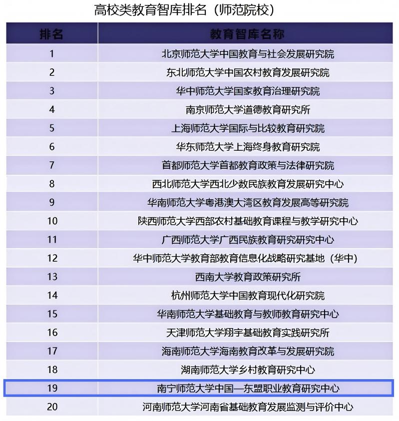 11月29日,长江教育研究院联合华中师范大学国家教育治理研究院发布了《中国教育智库评价SFAI研究报告》(2025年版)。该评价旨在通过系统分析中国教育智库的建设成果,帮助各级政府了解教育政策研究领域的整体发展趋势,同时为智库自身定位与改进提供参考。根据本次评价结果,开元官网中国—东盟职业教育研究中心(以下简称“中心”)成功入选“中国教育智库榜单”(高校类教育智库排名-师范院校),实现连续入选该榜单的佳绩。