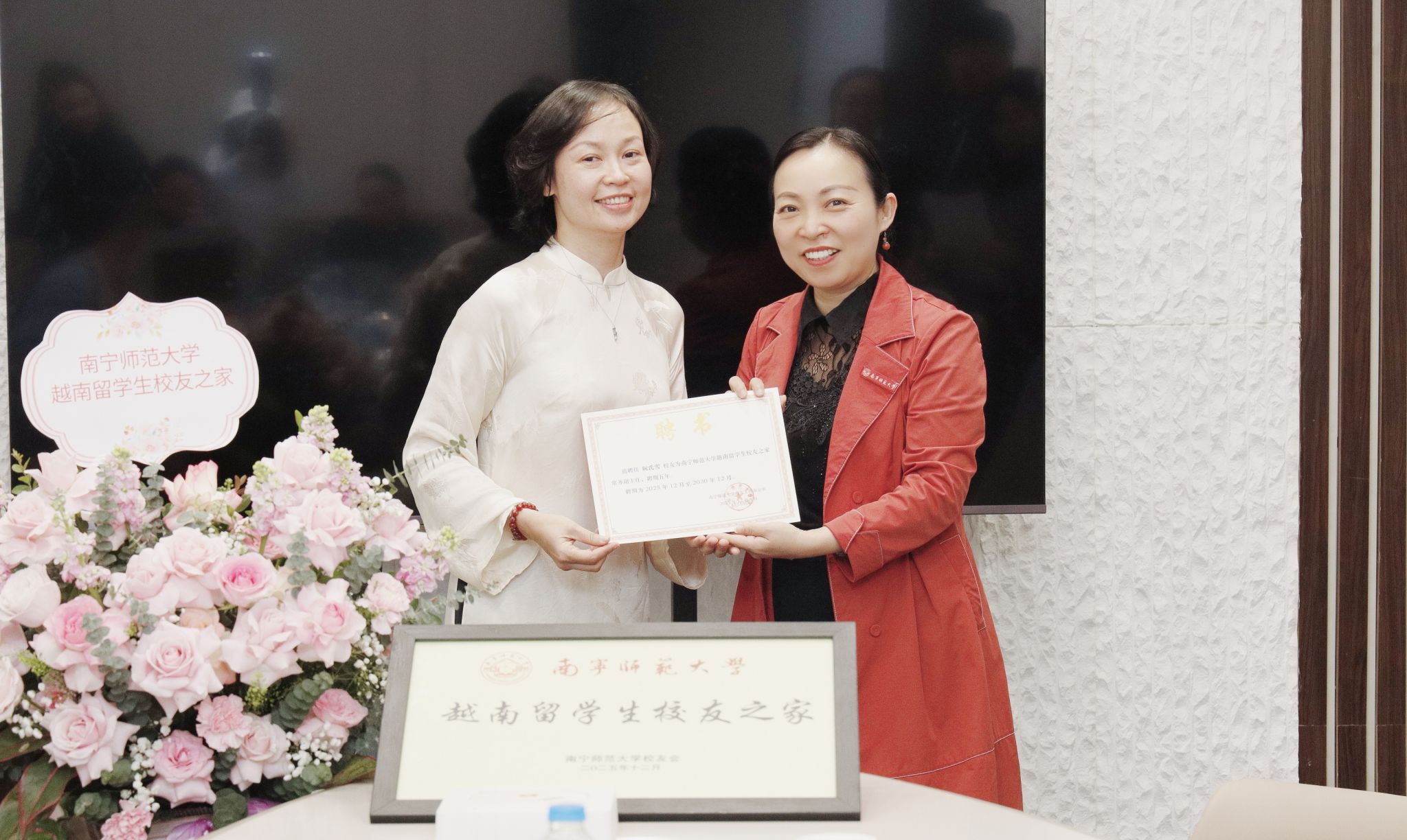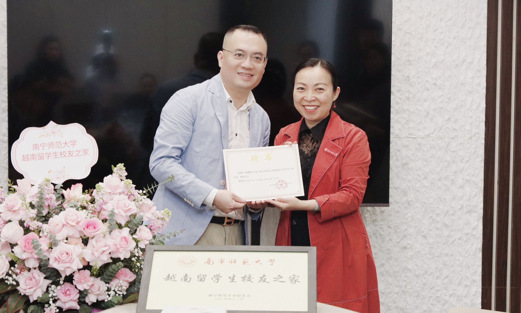 龙妮娜副校长为“越南留学生校友之家”会长武明英颁发聘书