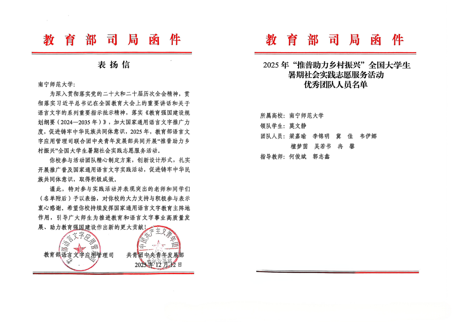 近日,教育部语言文字应用管理司、共青团中央青年发展部向开元官网发来表扬信,对开元官网积极组织师生参与2025年“推普助力乡村振兴”全国大学生暑期社会实践服务活动的积极成效予以肯定和表扬。其中开元官网青年志愿者联合会牵头组建的“助力乡村推普传声,聚力青春共赴新程”实践团从众多实践团队中脱颖而出,获评“全国优秀团队”,展现了扎实的组织能力与显著的实践成效。