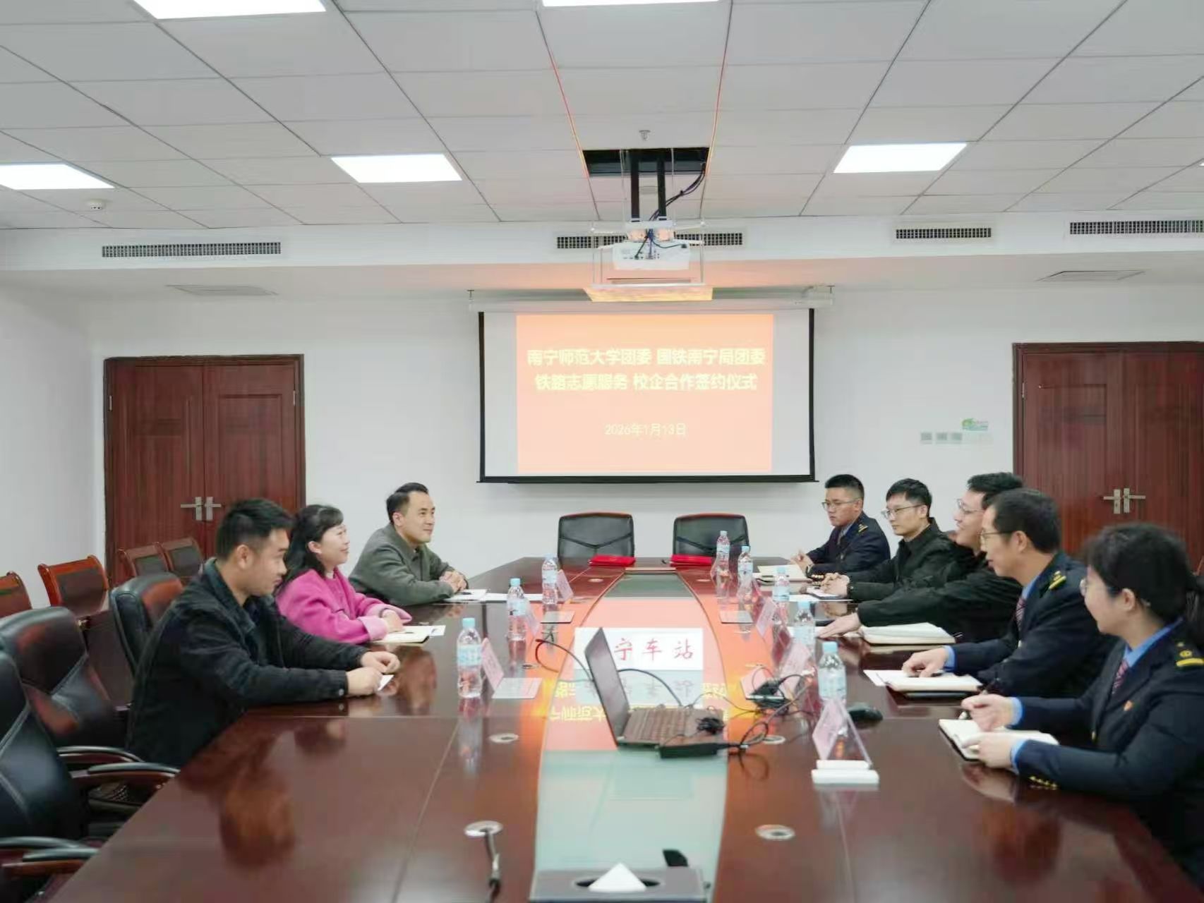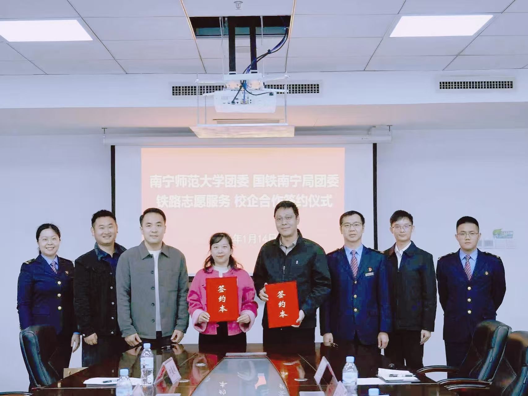 为推动志愿服务品牌化发展,深化校企协同育人实效,1月14日,校团委与国铁南宁局团委于南宁东站举行铁路志愿服务校企合作签约仪式。学校团委副书记(主持工作)李静、副书记何俊斌,国铁南宁局团委书记饶勇、南宁车站党委副书记马常宏及相关工作人员参加本次签约活动。