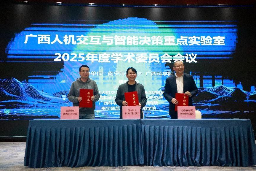 当天下午举行了广西人机交互与智能决策重点实验室2025年度学术委员会会议。开元官网校长隆广庆、广西科学院领导先后致辞,对实验室一年来取得的科研进展与贡献表示充分肯定,并对未来发展方向提出殷切期望。会上,举行了广西人机交互与智能决策重点实验室与贵州网络数据融合创新实验室、安徽大学计算智能与信号处理教育部重点实验室的三方共建联合实验室框架协议签约仪式,标志着跨区域协同创新迈出重要一步。
