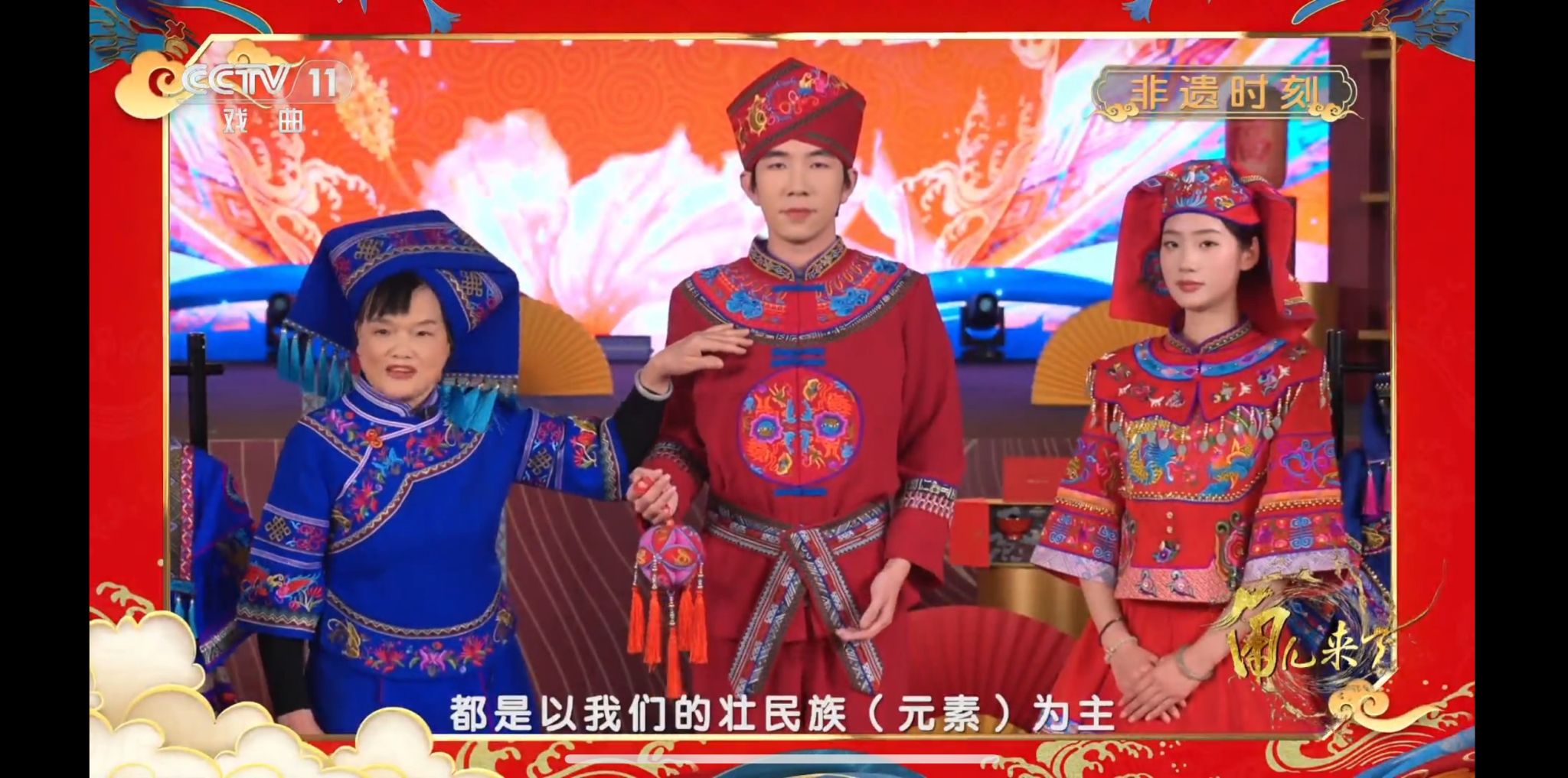 节目通过“实景展示+现场演绎+匠心讲述”的立体模式,生动拆解了壮锦这一古老工艺从纹样设计、手工挑花到织造的全过程。陆兰珍女士在镜头前细致演示了每一道工序,并深情讲述了壮锦纹样中蕴含的民族历史与文化信仰。两位学生在互动中亲身试穿了经纬交织的技艺精髓,实现了非遗技艺“可感、可知、可参与”的活态传承。