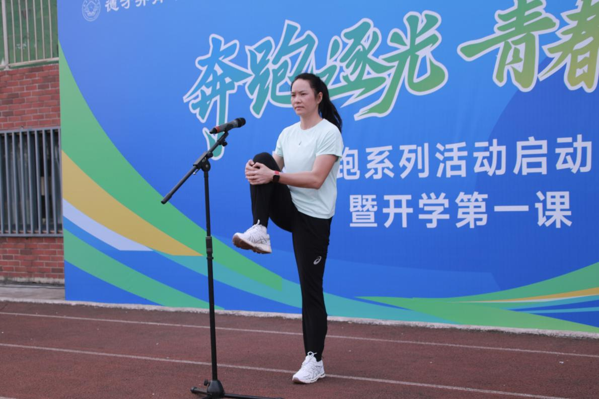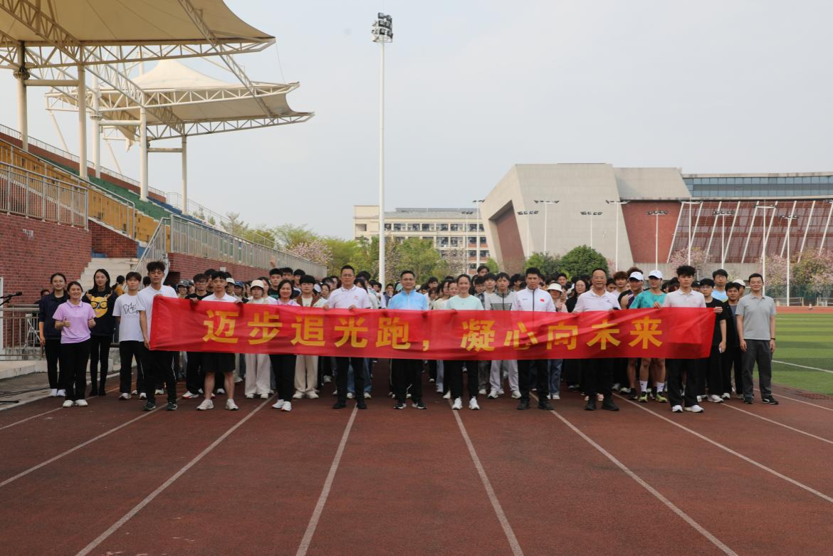 韦永丽带领全体师生进行热身运动,以自身经历诠释体育精神。热身结束后,发令号响起,由校领导、嘉宾和师生代表组成的队伍沿武鸣校区校道开跑,途经音乐与舞蹈学院、桂园食堂、全国大学生创新创业基地、实验楼、图书馆等地,最终返回松园体育场,全程约3.6公里。沿途不少学生驻足观看、加油助威。