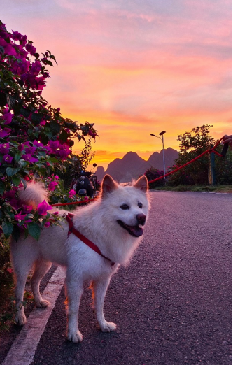 或许在狗狗的世界里,它无法用言语来表达对这美景的赞美,但从它那欢快的动作和满足的神情中,可以感受到它内心的愉悦。三角梅的艳丽与夕阳的温柔,似乎给它带来了一种难以言喻的快乐。