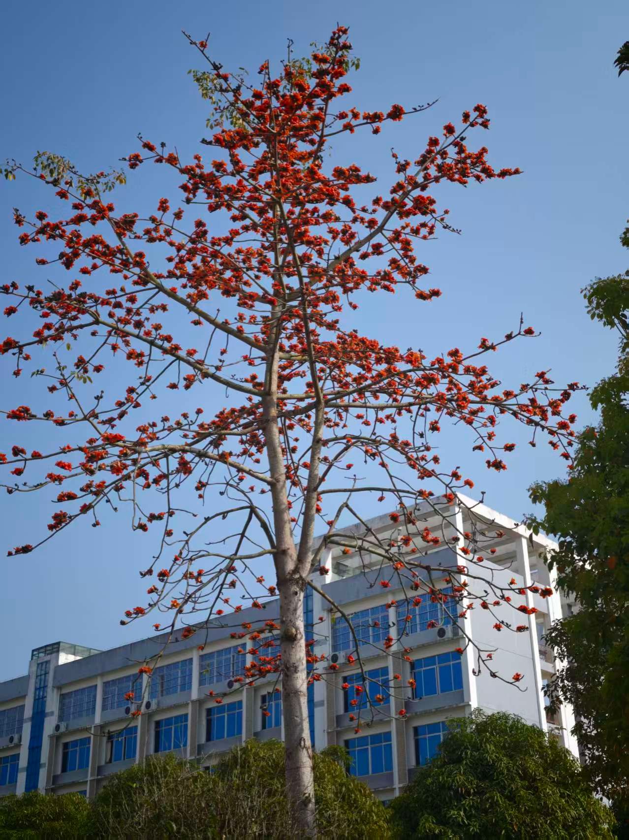 它高大,沉默,光秃秃的枝干直戳戳地指向天空,像倔强老人的手臂。叶还没长,花倒先开了——硕大的、红艳艳的朵儿,沉甸甸地缀在枝头。那红是烈的,是浓的,是憋了一整个冬天的劲,一朝迸发出来的。每一朵都像一团火,在还有些清冷的空气里,固执地燃着。远远望去,整棵树便像擎着无数支小小的火炬,照亮了三月的天。