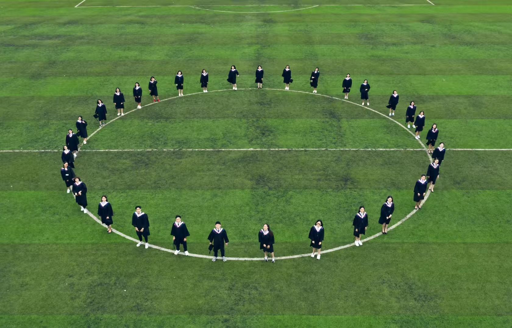 在那片充满活力的绿茵操场上,我们身着整齐的学士服,手拉手围成一个紧密的圆圈。指尖相触的温度,传递着对彼此的不舍,也诉说着对母校深深的眷恋。温暖的阳光倾洒而下,为我们镀上一层金色的光芒,映照出青春最耀眼的模样。此刻,我们就是校园里最美的风景,将这份情谊与不舍定格在镜头之中。