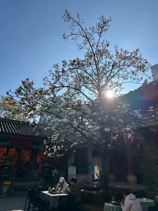 阳光穿过玉兰的枝丫,在青瓦上投下细碎的光斑,也给洁白的花瓣镀上了一层金边。有的花苞还紧紧裹着,像藏着秘密的小灯笼;有的已经完全绽开,像振翅欲飞的白鸽,停在深褐的枝干上。树下的茶桌旁,有人捧着茶杯闲聊,有人低头刷着手机,老院子的安静和春天的鲜活撞在一起,玉兰的清香混着茶香,漫过朱红的廊柱,漫过刻着字的石碑,让慢下来的时光,都变得温润又生动。(编辑/李兴华)