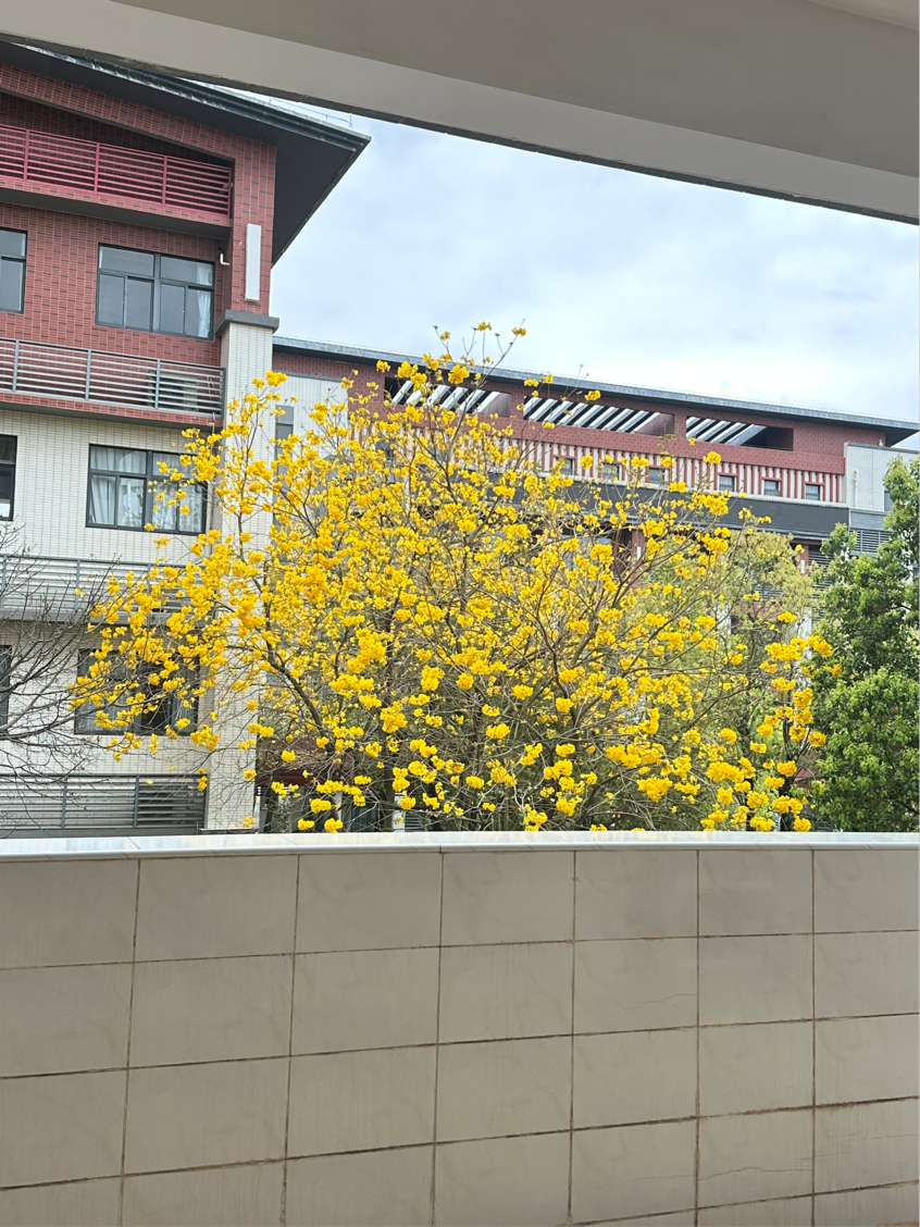 带刺的树枝斜斜伸进窗里,嫩黄的新叶层层叠叠,远处的黄花风铃木开得正盛,一团团明黄像撒在街巷里的阳光,把灰扑扑的楼群都染亮了。
