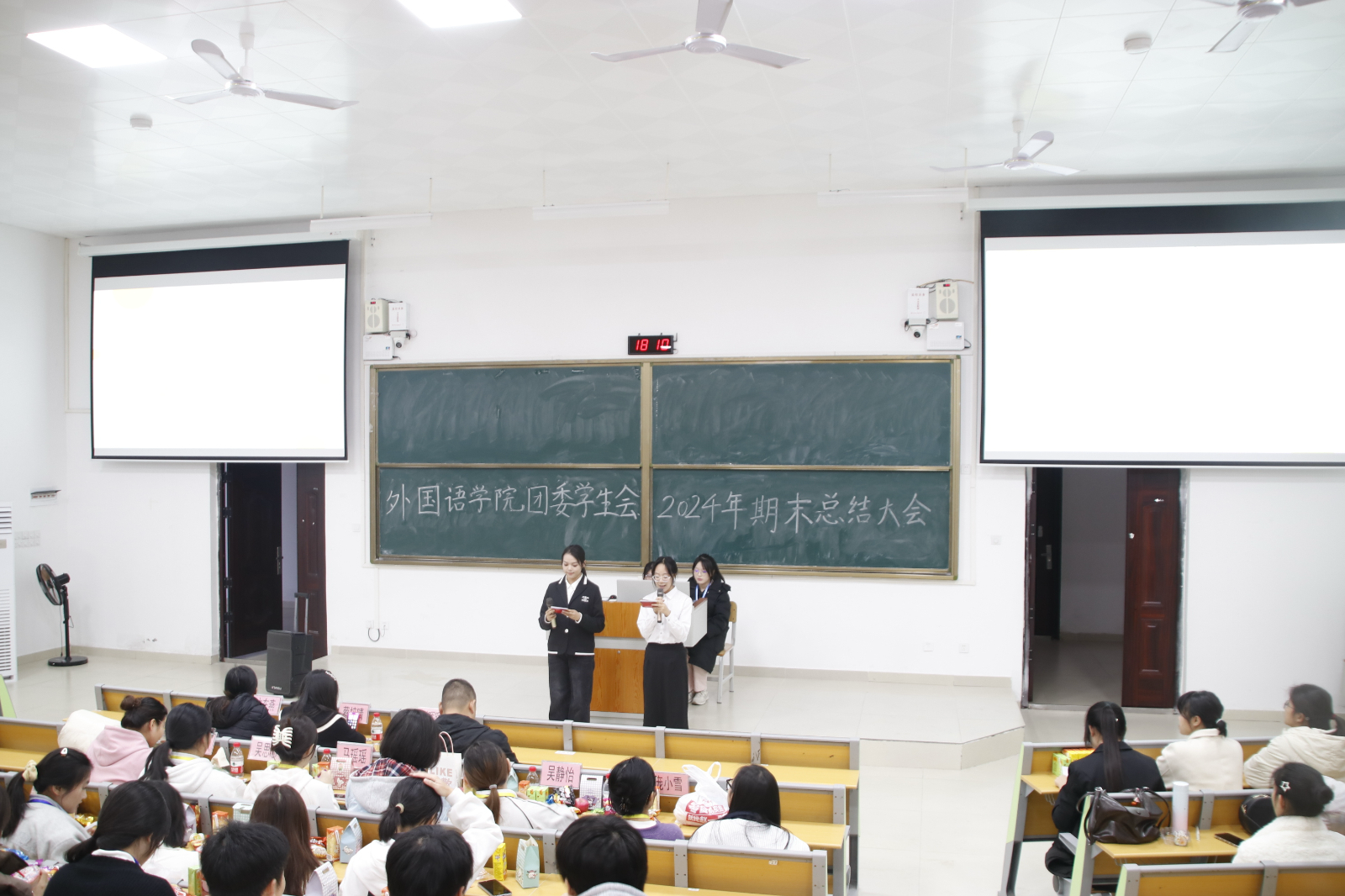 2024年12月24日晚,外国语学院于武鸣校区实验楼2-B108教室召开团委学生会本学期期末总结大会。学院党委副书记刘晖晖、学工办蔡梓晴老师、古东燕老师、团副主席团成员以及团委学生会全体成员们出席本次会议。