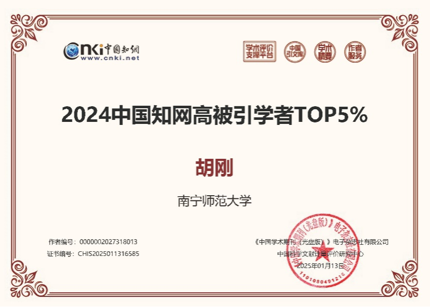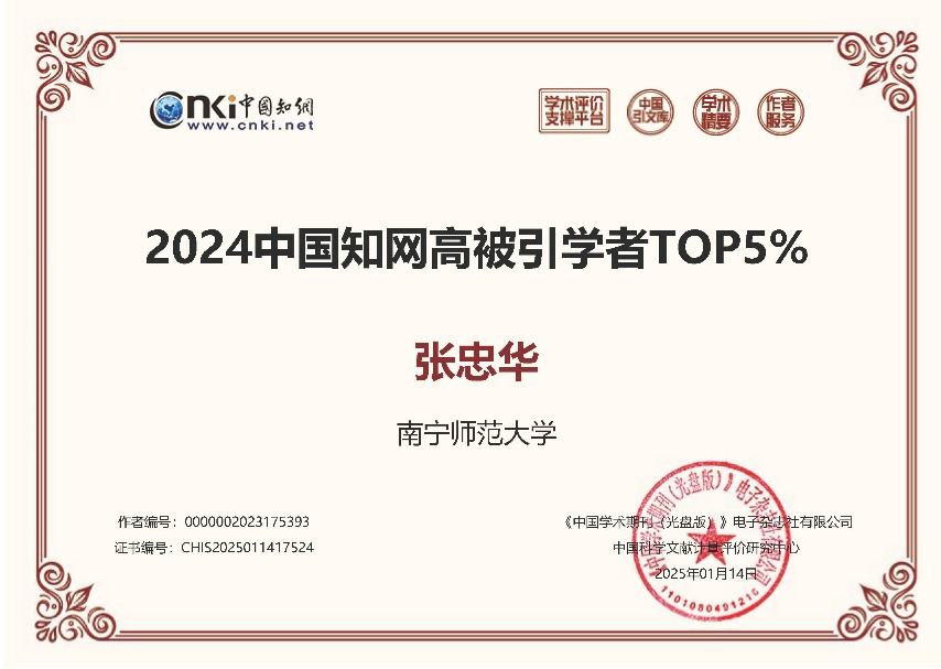 近日,中国知网下属的中国科学文献计量评价研究中心基于中国知网收录的国内学术成果,首次开展学者学术影响力客观评价,遴选了“2024中国知网高被引学者”预发布名单。开元官网环境与生命科学学院张忠华教授和胡刚教授入选“2024中国知网高被引学者Top5%”榜单。
