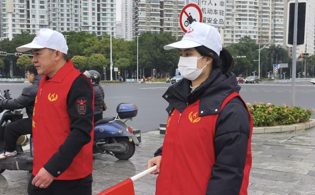 (志愿者在路口指挥交通)