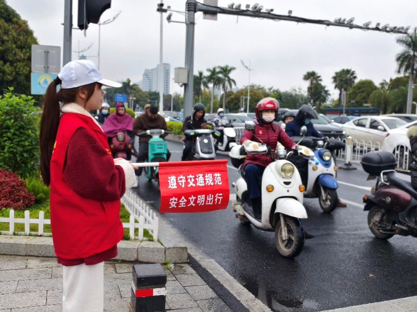 在第一组志愿者的示范引领下,后面的志愿者迅速上手,对电动车越线停车、行人闯红灯等违规行为进行了有效劝阻。同时,针对骑行不戴头盔、过马路玩手机等危险行为,志愿者们手持文明标语牌进行宣传,提醒市民注意交通安全。在交警的帮助下,志愿者们圆满完成了此次志愿服务活动。