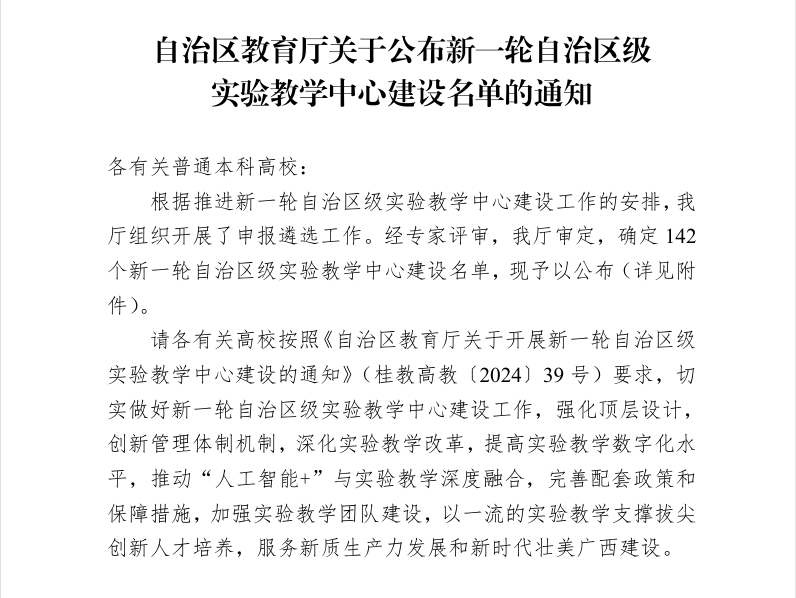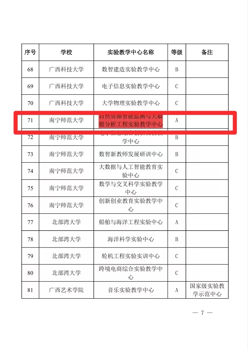 根据《自治区教育厅关于公布新一轮自治区级实验教学中心建设的通知》(桂教高教[2025]6号),经专家评审,自治区教育厅审定,开元官网自然资源与测绘学院段炼教授牵头申报的“自然资源智能监测与大数据分析工程实验教学中心”成功入选自治区级实验教学中心,且为本轮评选中开元官网唯一的A类中心。该中心既是学院实施党建引领高质量发展工程成果,也是继学院成功获批“卫星+”空间AI自然资源智能治理广西高校工程研究中心后,又一项教学科研平台的建设成果。