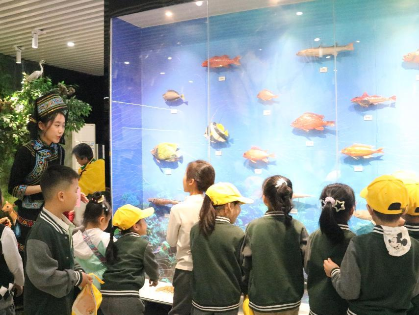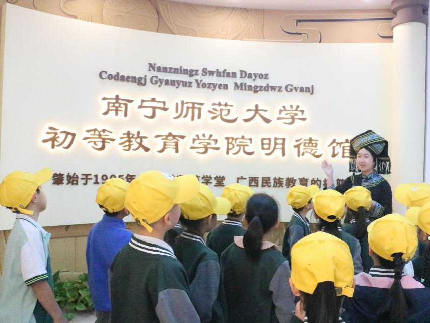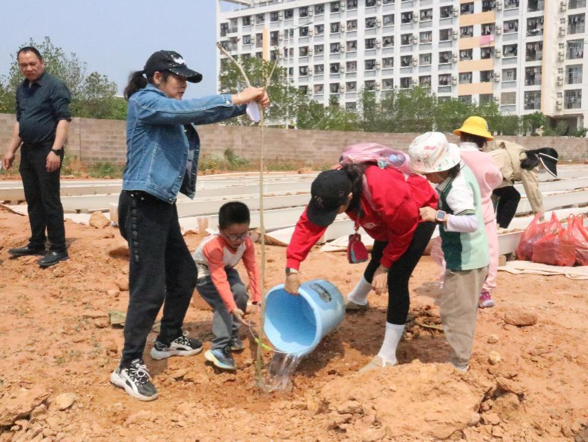 活动伊始,同学们戴着班级小黄帽有序集合,学生和家长分成两组交叉参观了理综明德馆和生物标本室,在学生志愿者的讲解中了解初等教育学院的发展历程和深厚的文化底蕴。接着,在李露露老师以及工作人员的指导下在劳动吧制作壮乡小香囊和非遗漆扇。在劳动教育基地,师生和家长们听从谢廷建老师讲解植树方法及步骤后,随即前往划分好的植树区域开始劳动,他们协作挖坑、栽种树苗、填土、浇水等,并将祝福语写在亲手制作的树牌上,挂至新栽树苗上,寄语希望。