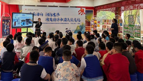 与此同时,一场关于广西壮族传统手工艺品----壮锦的介绍也在天桃实验小学的创新智慧教室展开了。2023级英语专业的冯佳怡同学身着壮族民族服饰,以“美丽壮锦:广西非物质文化遗产的瑰宝”为题,结合精心设计的图文和短视频向天桃实验学校的小朋友们展示并介绍了壮锦的美丽花色、壮锦图案中的动人传说、壮锦的制作流程以及壮锦在当代的发展与传承。在冯佳怡同学的启发和引导下,现场的小观众们当场就学会了许多跟壮锦花色、图案有关的英语表达。在有奖问答环节,小朋友们都积极踊跃参与。有的小朋友不仅记住了壮锦的制作流程还能用英语进行简单地介绍,还有的小朋友甚至能用刚学会的英语句子,展开想象,绘声绘色地讲述了壮锦图案上的凤鸟飞进教室现场的有趣情节。