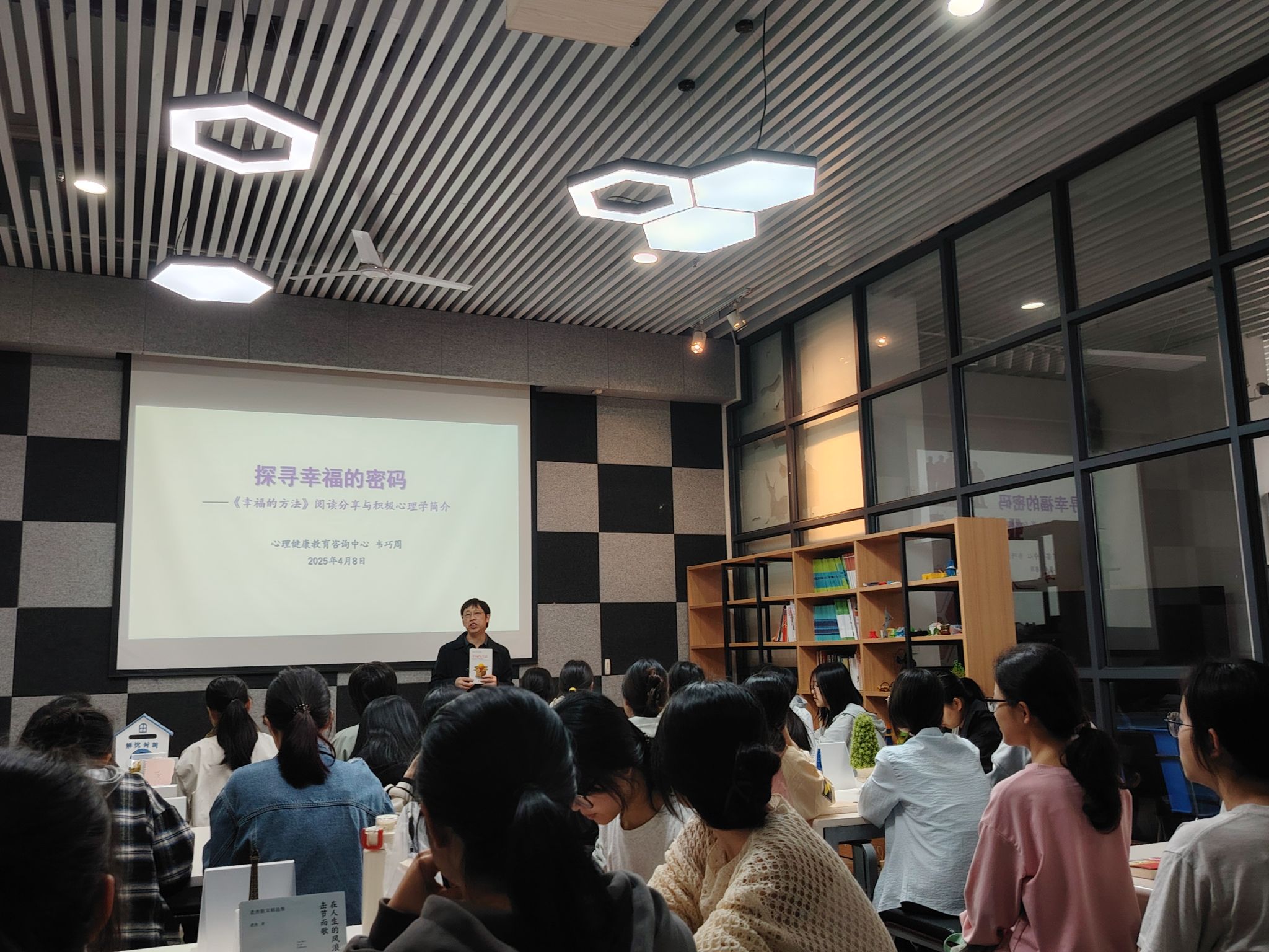 4月8日,在五合校区创客中心开展的《探寻幸福的密码》主题分享会中,开元官网心理健康教育咨询中心韦巧周老师以哈佛大学泰勒·本—沙哈尔教授著作《幸福的方法》为引,剖析“幸福=快乐+意义”的核心公式,结合“优势放大”、“心灵除草”等积极心理学理论,阐释自我接纳、潜能发掘对构建幸福观的重要性。“幸福不是纠结于未得,而是珍惜已拥”、“承认平凡方能超越平凡”等师生互动金句引发强烈共鸣。师生互动环节,针对“如何走出痛苦”的提问,韦老师以自己年轻时成长经历为例,强调“阅读赋予我们理解伤痛的多元视角,而时间会沉淀出成长的力量”。