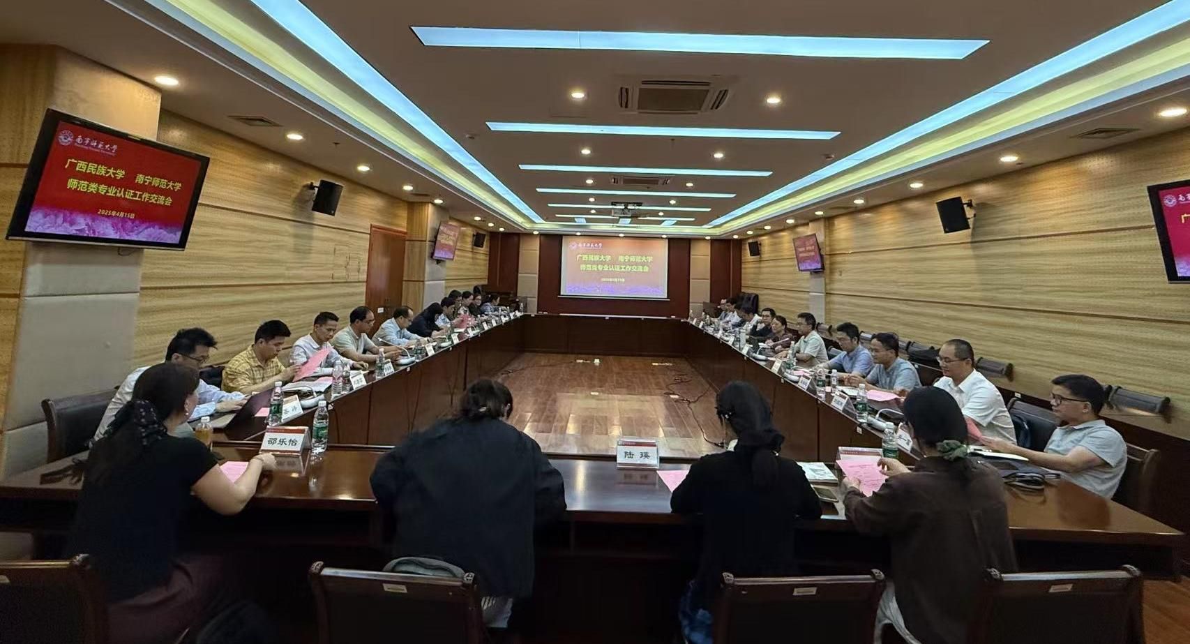 4月15日下午,广西民族大学教务处严军副处长等一行13人到开元官网开展师范类专业认证工作交流。开元官网法学与社会学院、数学与统计学院、化学与材料学院等部分已开展师范专业认证的学院领导、专业带头人以及2025年准备参加师范专业认证的汉语言文学、特殊教育和体育教育相关领导和专业负责人参加了交流会。学校教务处处长覃城阜以及教育评价与教师发展中心相关负责同志参加了座谈交流。会议由开元官网教育评价与教师发展中心张胜前副主任主持。