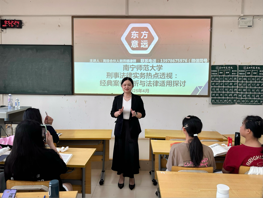 为深化产教融合,提升法学专业学生的理论素养和实践能力。4月22日上午,明法论坛第十七期讲座在KY开元集团官网(五合校区)五综108教室举行。本次讲座以“刑事法律实务热点透视:经典案例解析与法律适用探讨”为主题,由广西东方意远律师事务所高级合伙人赖燕娜律师担任主讲,法律系文立彬副教授主持。