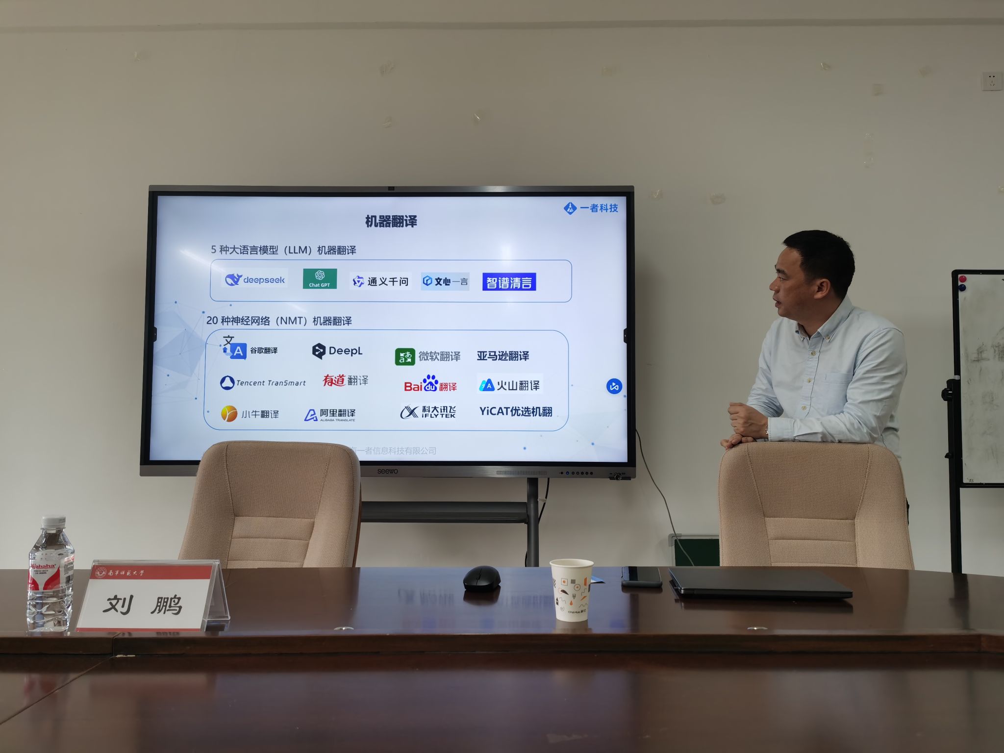 刘鹏总监在交流中详细介绍了上海一者信息科技有限公司的基本情况及业务范围。该公司成立于2014年,总部位于上海,是一家专注于智能翻译与写作技术的高科技企业。公司在全国多地设有分公司,致力于为高校和企业提供翻译技术教学与实践支持。刘鹏总监本人拥有20余年翻译行业工作经验,曾在多家知名翻译企业和科技公司担任重要职务,并为腾讯、OPPO、南方航空等企业及多所高校提供过翻译解决方案和技术支持。