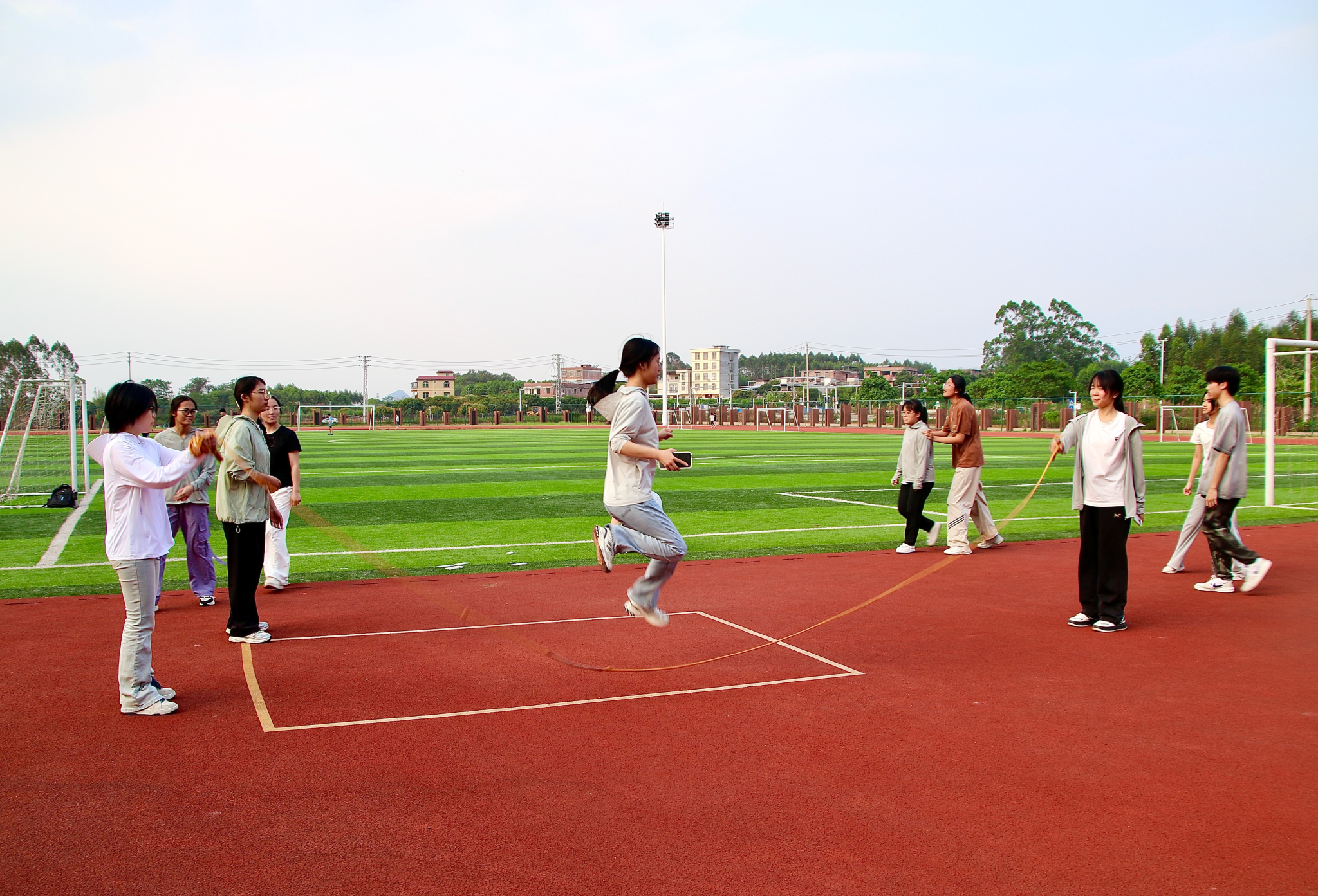 此外,本次活动还开展了跳长绳比赛。截至4月29日,已有两批同学参与其中,分别是223、234、235、242班和222、232、244、245班。在晴朗的下午,大家齐聚兰园操场,开启跳长绳运动之旅。在工作人员的引导下,摇绳的同学有节奏地挥动着长绳,其余同学排列成队,他们的目光锁定翻飞的绳子,在长绳落地的瞬间迅速跃入绳圈,跨过绳子后快速跑出。后面的同学紧跟节奏,依次跃入。大家配合默契,即使偶有失误也能迅速调整,操场上欢笑不断,洋溢着欢快的氛围。