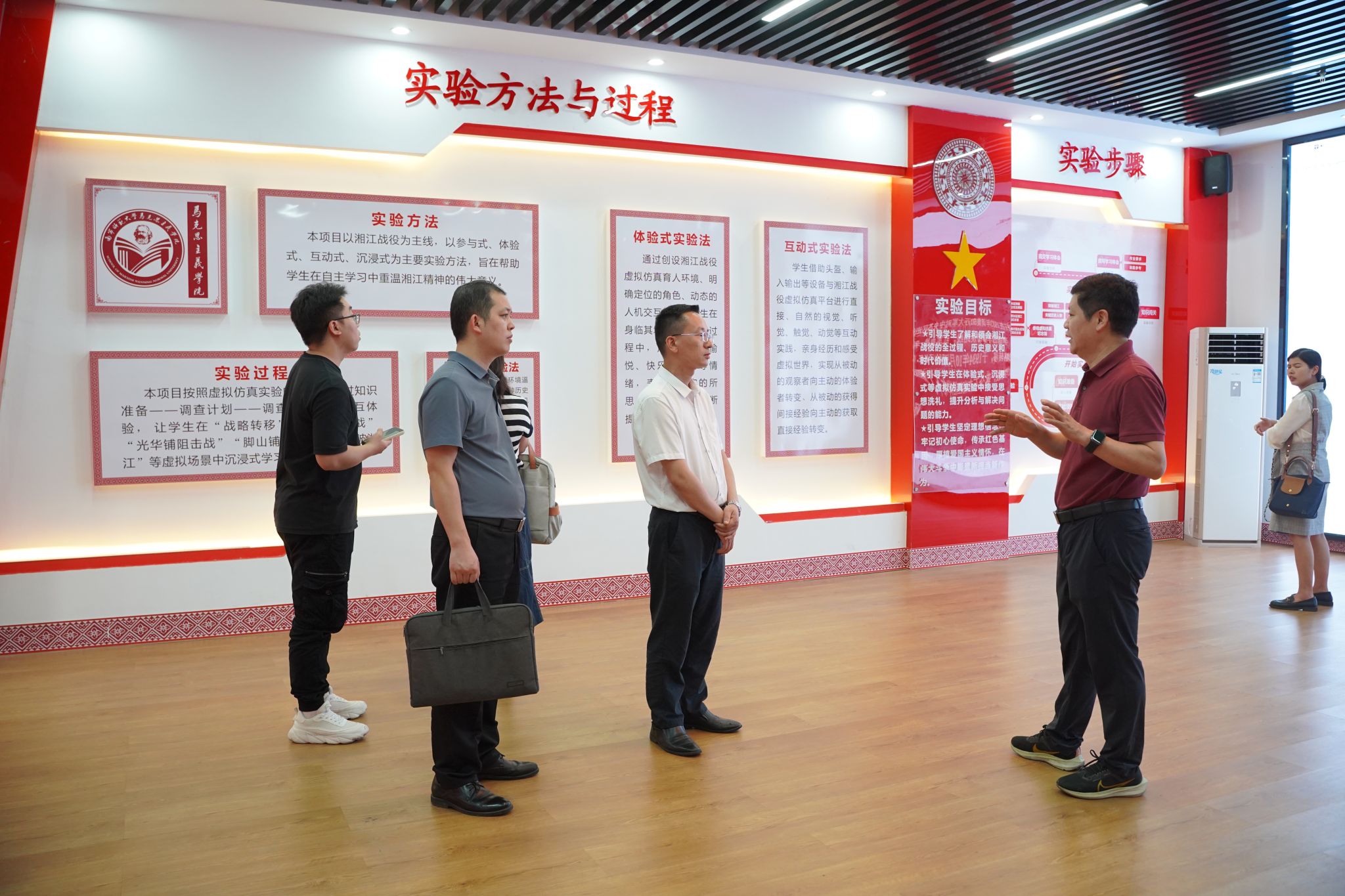广西电力职业技术学院马克思主义学院的教师们先后在3名讲解员带领下,参观了马克思主义理论教育广场、党史育人画廊、科学社会主义发展史教育馆、广西新时代爱国主义教育虚拟体验中心、湘江战役虚拟仿真实验中心等特色文化育人教学场所。随后,在马克思主义学院会议室举行了座谈交流会。会上,曾令辉院长围绕马克思主义学院建设、学科建设、教学改革、科学研究、社会服务等方面进行了介绍,详细介绍了马克思主义学院思政课教师队伍建设的主要做法和经验成效。曾院长强调,学院始终将教师队伍建设作为学院发展的第一要务来落实,教师是学院发展的主体,教师强,学院兴,育人好。学院注重教师职业发展和团队建设,不断提升教师的学科意识、教学能力、科研能力和育人能力,推进教师科研与教学双向融合,倡导把论文写在教学课堂中,教学出问卷,科研来答题,成果进课堂。随后,各教研室主任还就相关思政课教学中有关议题进行了深入的交流。最后,李次春书记对马克思主义学院经验分享表示衷心感谢。他指出,此次交流学习收获颇丰,尤其是党建引领思政课教学改革、“大思政课”建设推进、教师队伍培养及以赛促教等内容,为学院深化思政课教育教学改革提供了宝贵借鉴。